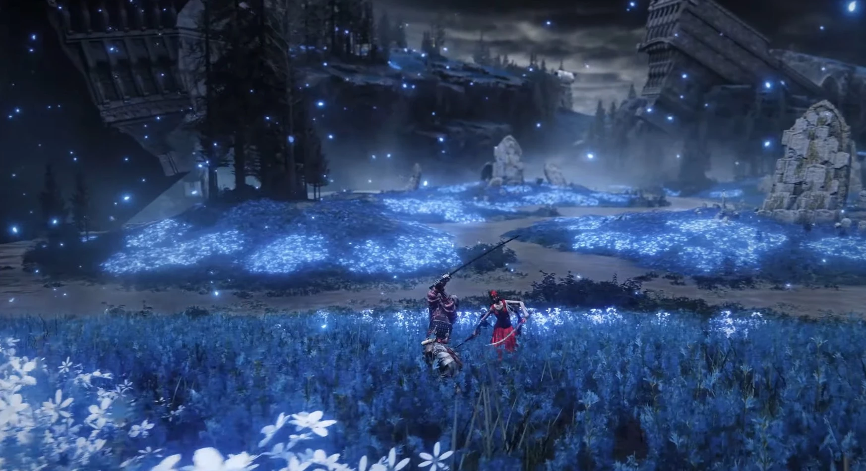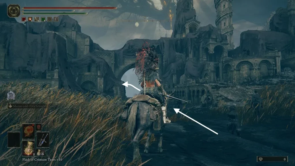 От Места благодати «Равнины Надгробий», первого костра в Царстве Теней, направляйтесь на северо-восток. На вашем пути встретятся «Обугленные руины» — идеальное место для передвижения на лошади.
