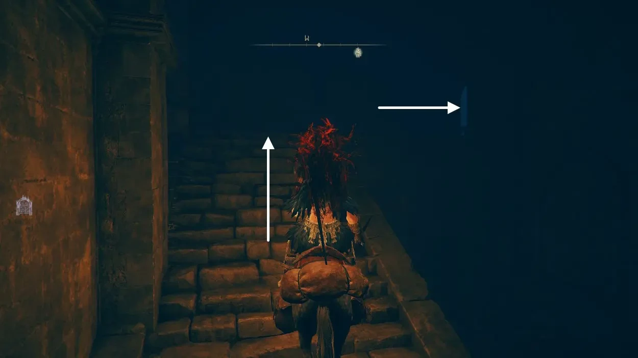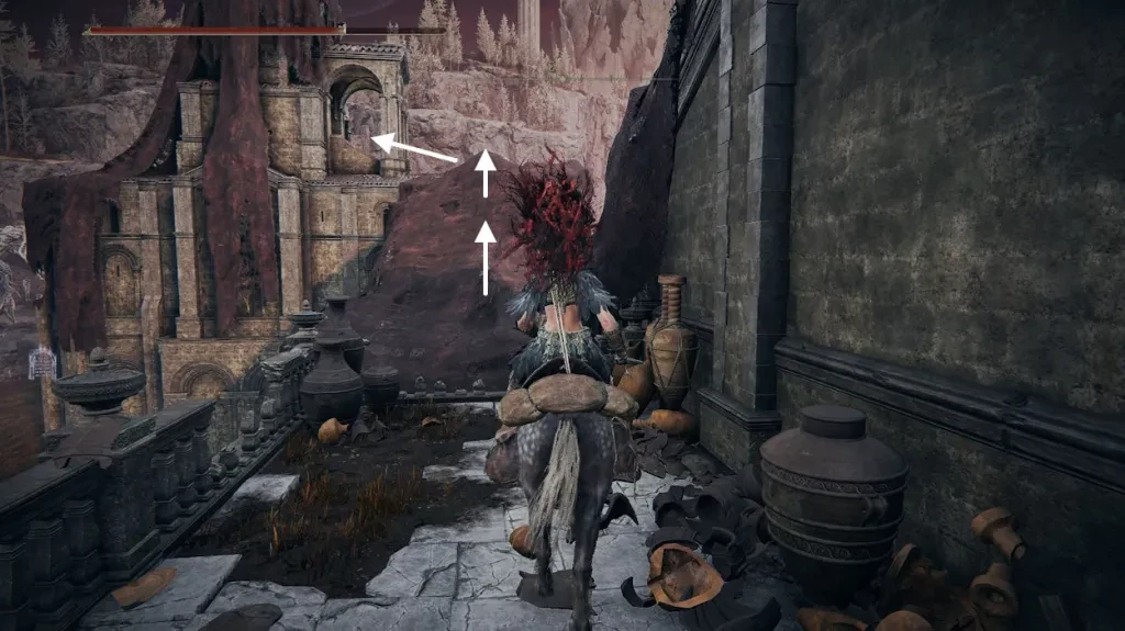 Скоро вы увидите массивное полуразрушенное здание, гордо возвышающееся над дорогой своей аркой — это ваша цель. Пролетаючи мимо медлительных и неагрессивных силуэтов, заверните налево и поднимитесь по лестнице направо.