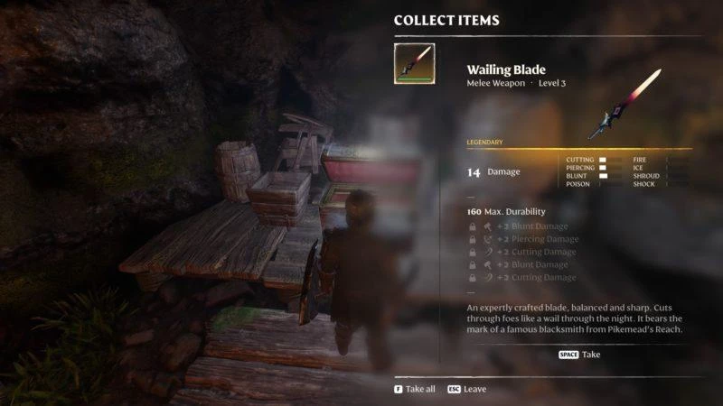 Плачущий клинок — это устрашающее оружие ближнего боя, обладающее базовым уроном 14 и максимальной стойкостью 160. Приятный факт заключается в том, что этот впечатляющий меч можно получить уже в самом начале своего приключения, так как его местоположение удобно расположено рядом с первой областью игры.