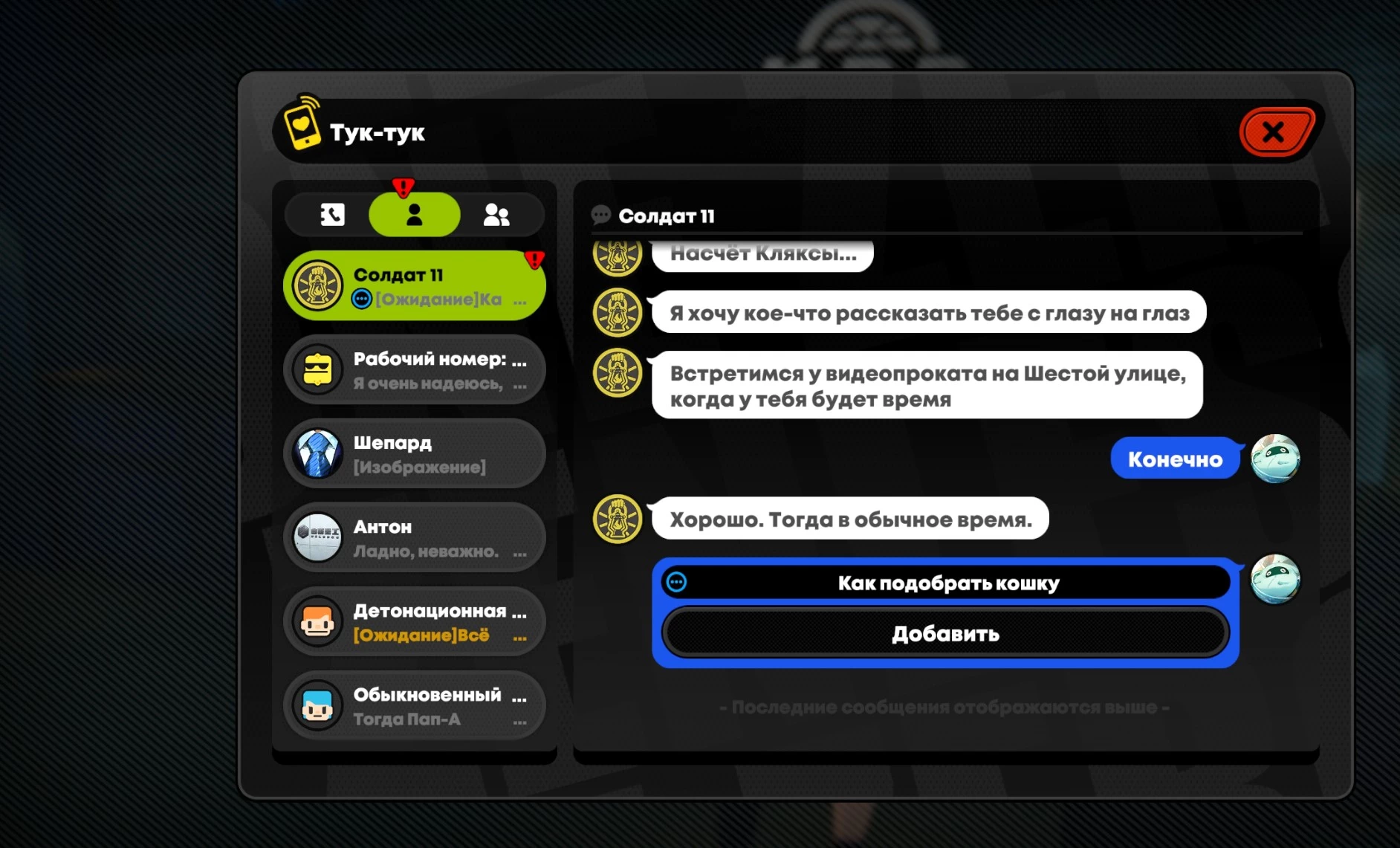 Солдат 11 вновь свяжется с вами, предложив найтись у видеопроката для откровенного разговора. На этой встрече она приведет с собой кошку и попросит вас приютить её.