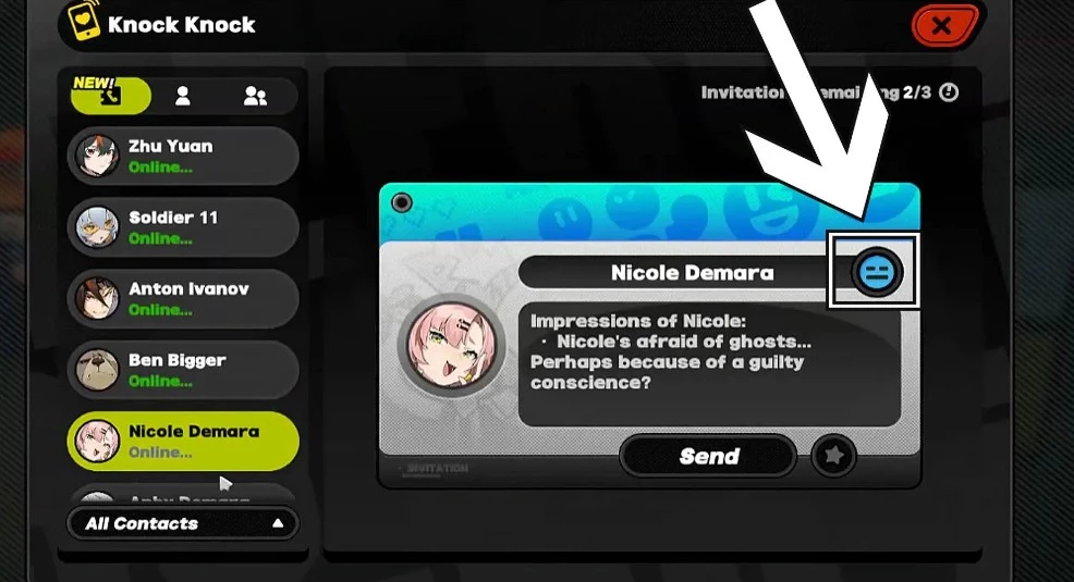 В «Zenless Zone Zero» существуют два способа оценить уровень доверия с агентом. Первый из них — это зайти в раздел «Контакты» личных сообщений и выбрать нужного агента. В правой части экрана появится небольшое меню с именем агента и смайлом рядом. Цвет и настроение этого смайлика отражают крепость ваших отношений: чем более радостен смайлик, тем выше доверие между вами.