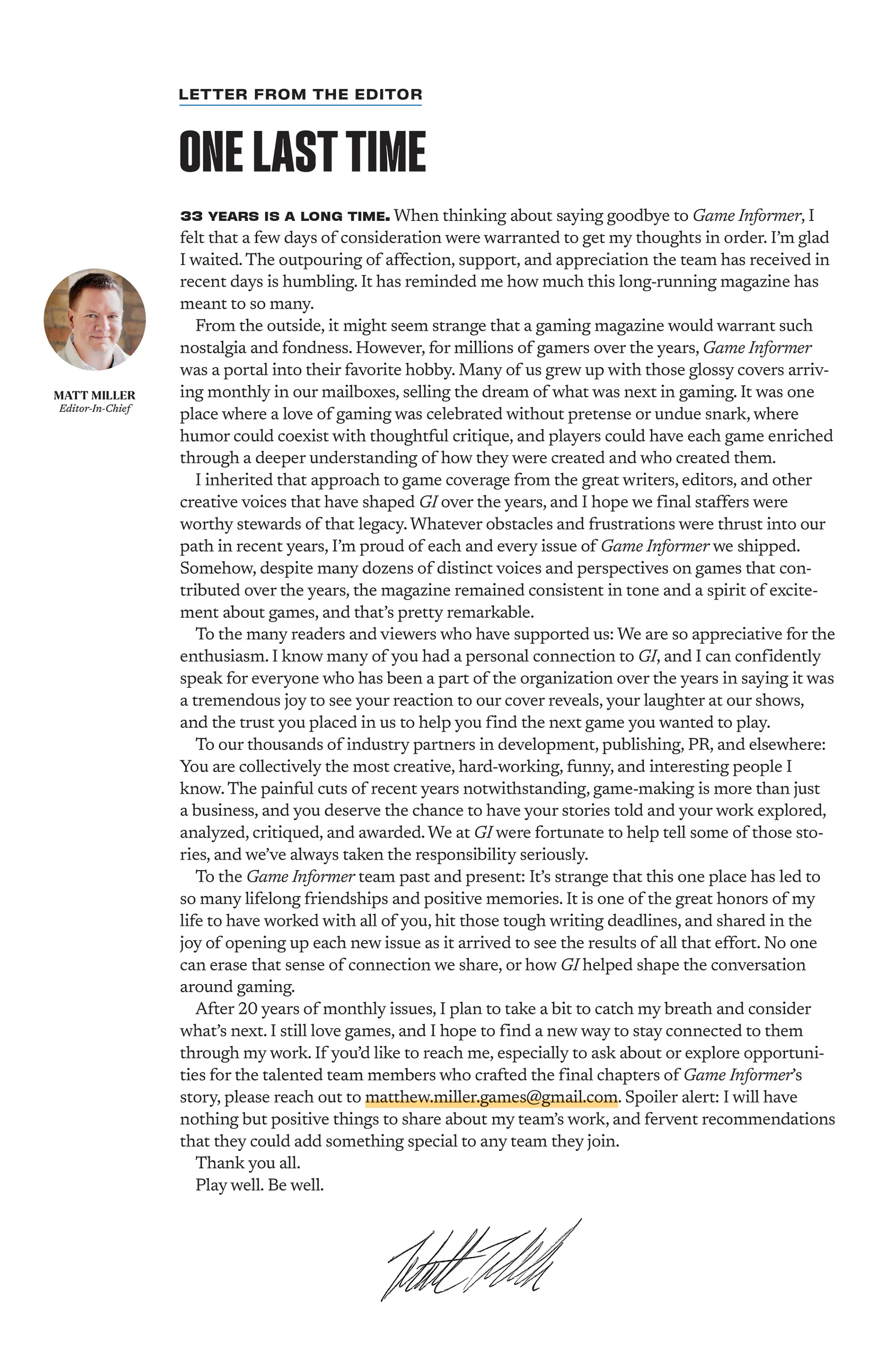 К счастью, бывший главный редактор Game Informer, Мэтт Миллер, вышел на связь с общественностью. Он опубликовал прощальное сообщение в соцсетях, выразив благодарность своим коллегам за долгую и успешную работу вместе.