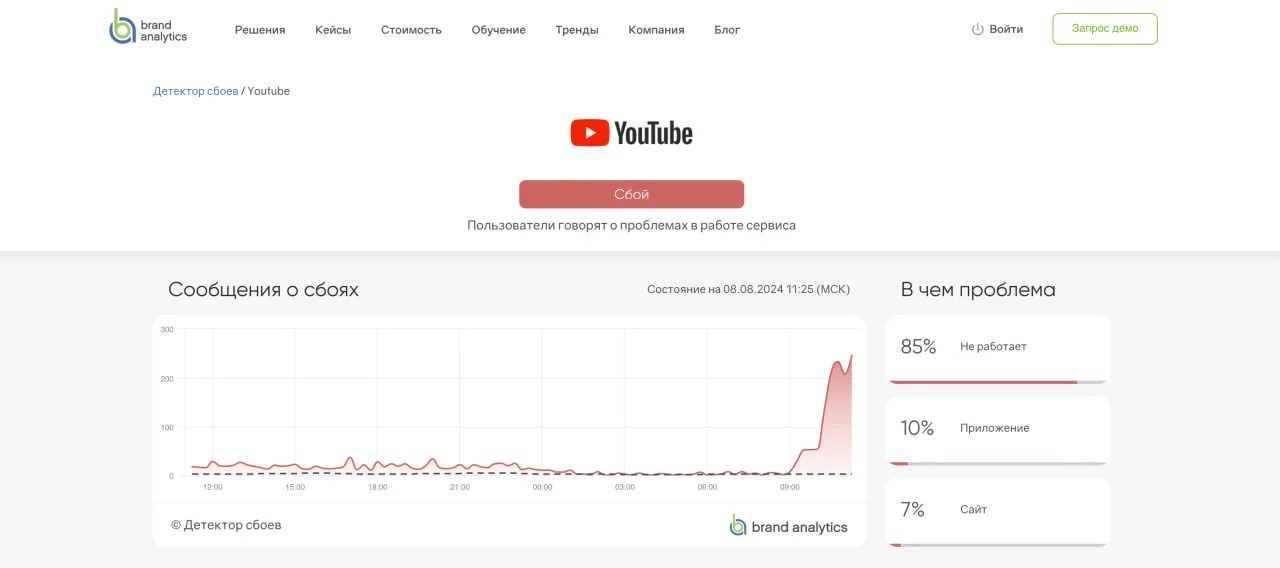 Пользователи в России активно сообщают о значительных проблемах с видеохостингом YouTube — у многих платформа просто не открывается. Проблемы начали проявляться сегодня, 8 августа, примерно с 9:30 по московскому времени, и количество жалоб на сбои в доступе к сайту стало расти.