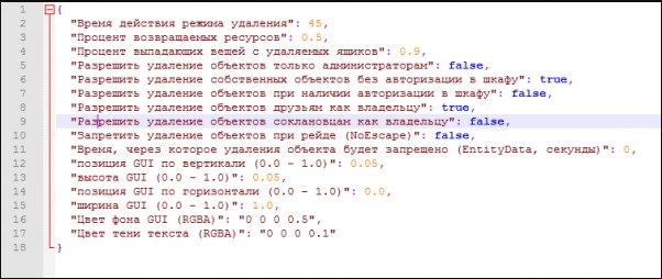 Плагин имеет ряд настроек. Они могут регулироваться, если открыть файл «Remove.json» в папке «config». Файл появится после установки плагина. Вот всё, что там есть по стандарту.