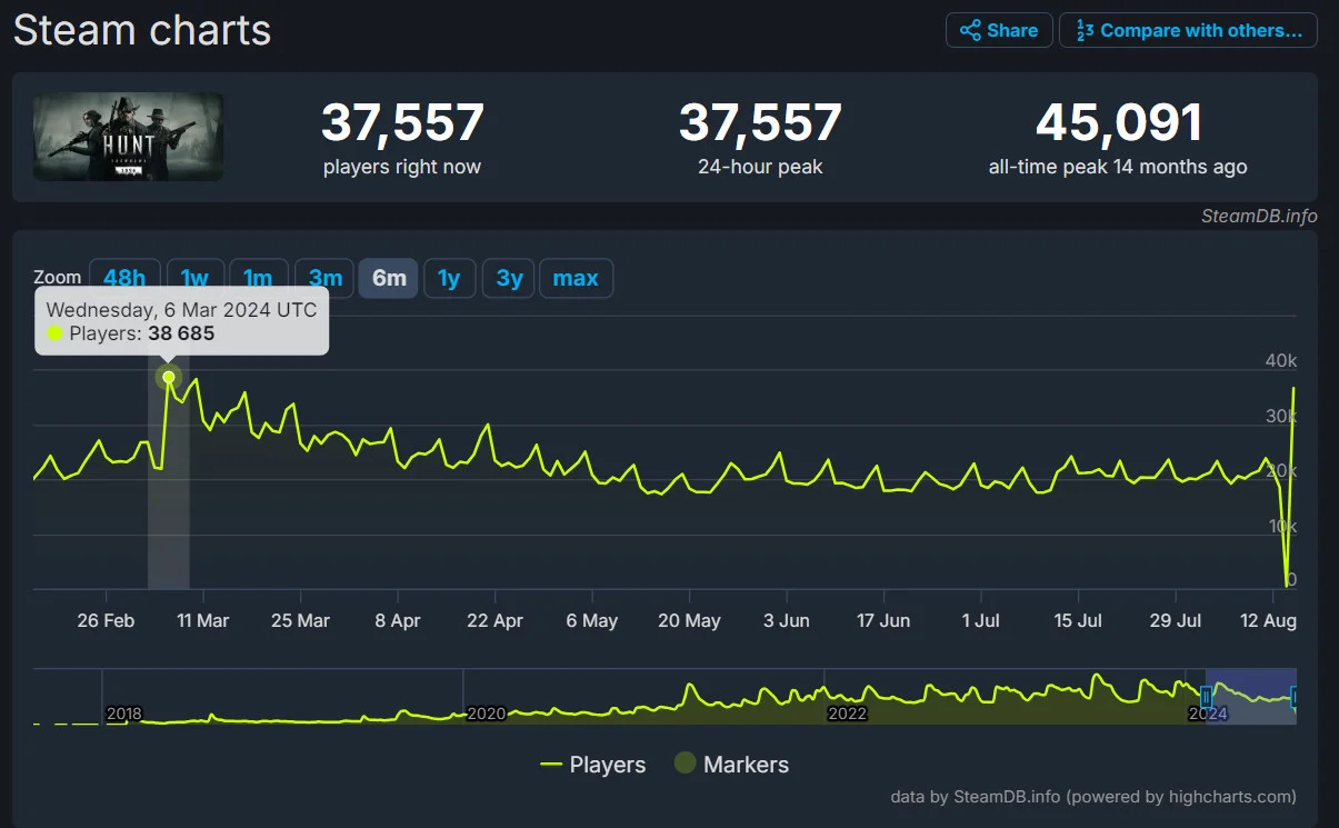 Тем не менее, обновление вызвало значительный интерес к Hunt: Showdown 1896. Максимальное количество игроков в сети за последние несколько месяцев достигло рекорда, превысив 37 тысяч на момент написания этой статьи. Подобные цифры были зафиксированы в марте 2024 года. Однако среди пользователей продолжают поступать жалобы на нестабильное соединение и трудности с поиском соперников для сетевой игры.