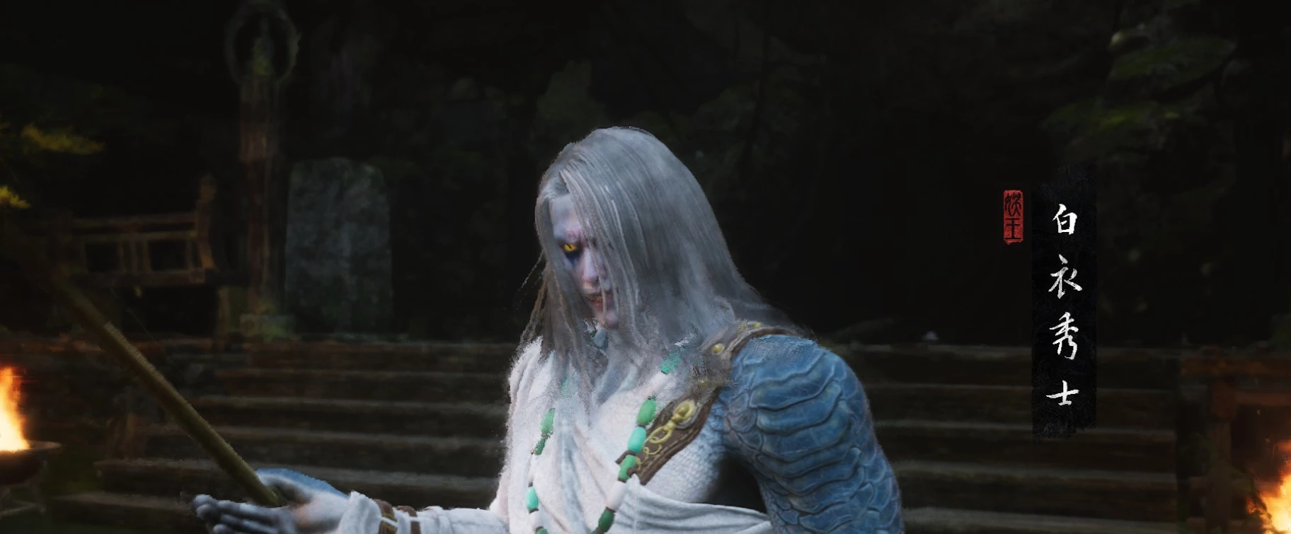 Сюцай в белых одеждах, представляет собой крайне сложного и неприятного противника, по крайней мере, из-за его превосходства в ловкости, скорости и силе по сравнению с Королем обезьян. Его стиль боя также схож — он использует множество прыжков, акробатических приемов и быстрых круговых атак. Однако вместо посоха у него копье, что делает его удары более смертоносными и даёт преимущество в атаке на средние дистанции благодаря длине его оружия. Сюцай способен сокращать расстояние, используя рывки или прыжки, которые завершаются чередой ударов. Это значительно усложняет задачу дойти до второй фазы с приличными запасами здоровья и зелий.