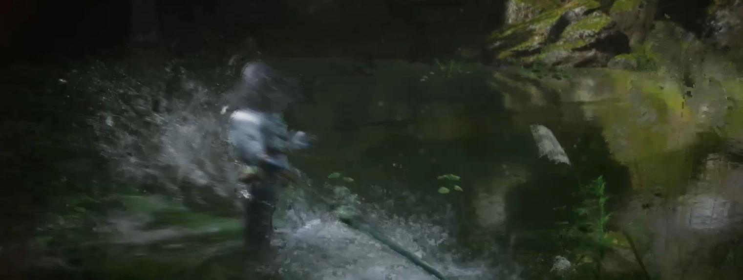 Кроме того, он может внезапно прыгнуть и метнуть копье в вас, а затем вернуть его обратно силой мысли. Если вы окажетесь рядом в момент атаки, то получите значительный урон, но анимация довольно продолжительная, что даёт шанс на уклонение. На расстоянии он также использует копье, вызывая водяные волны, которые охватывают арену. Чтобы избежать повреждений, необходимо точно рассчитывать время для уклонений. Хоть держаться ближе и кажется выгодным, именно в ближнем бою Сюцай наносит самые страшные удары.