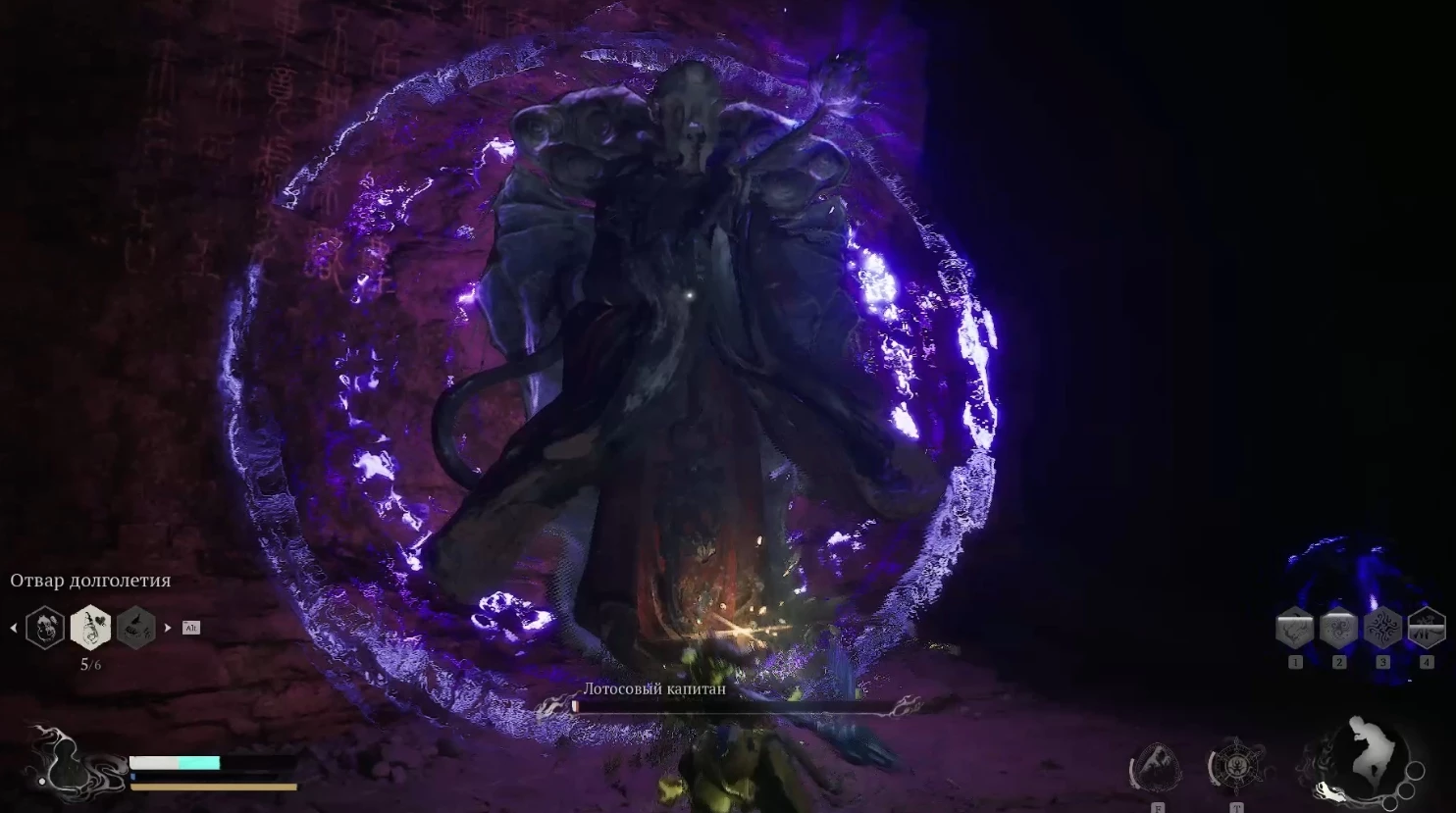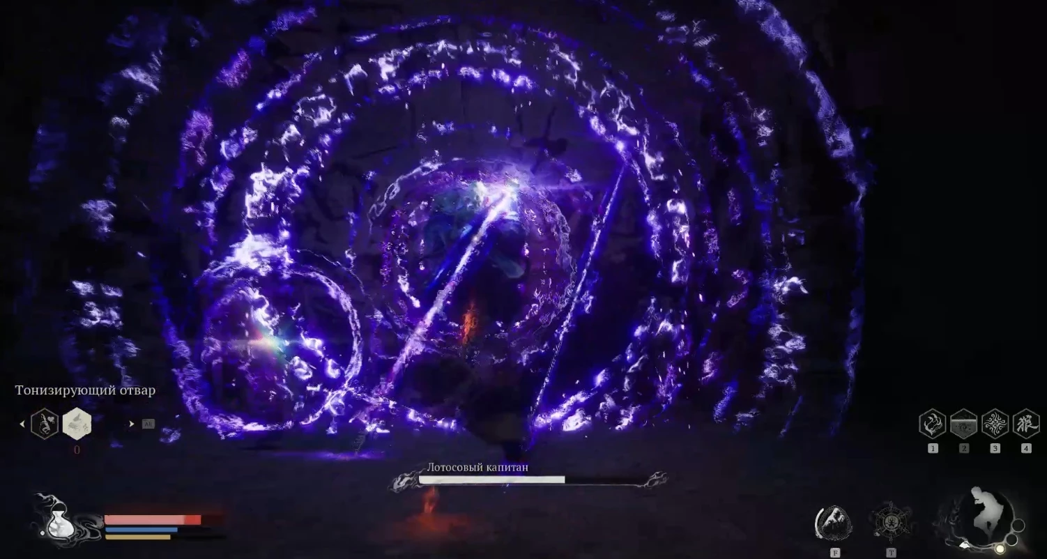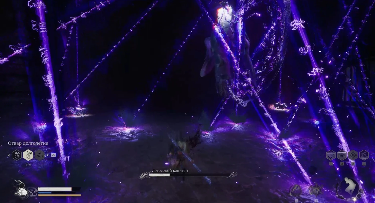Когда здоровье Лотосового капитана опустится ниже половины, он начнет телепортироваться чаще и использовать новые приемы с самонаводящимися фиолетовыми снарядами, которые будут следовать к вам по весьма неожиданным траекториям. В такой ситуации можно лишь уклоняться с точностью, активировать невидимость или приготовиться к потере части здоровья.