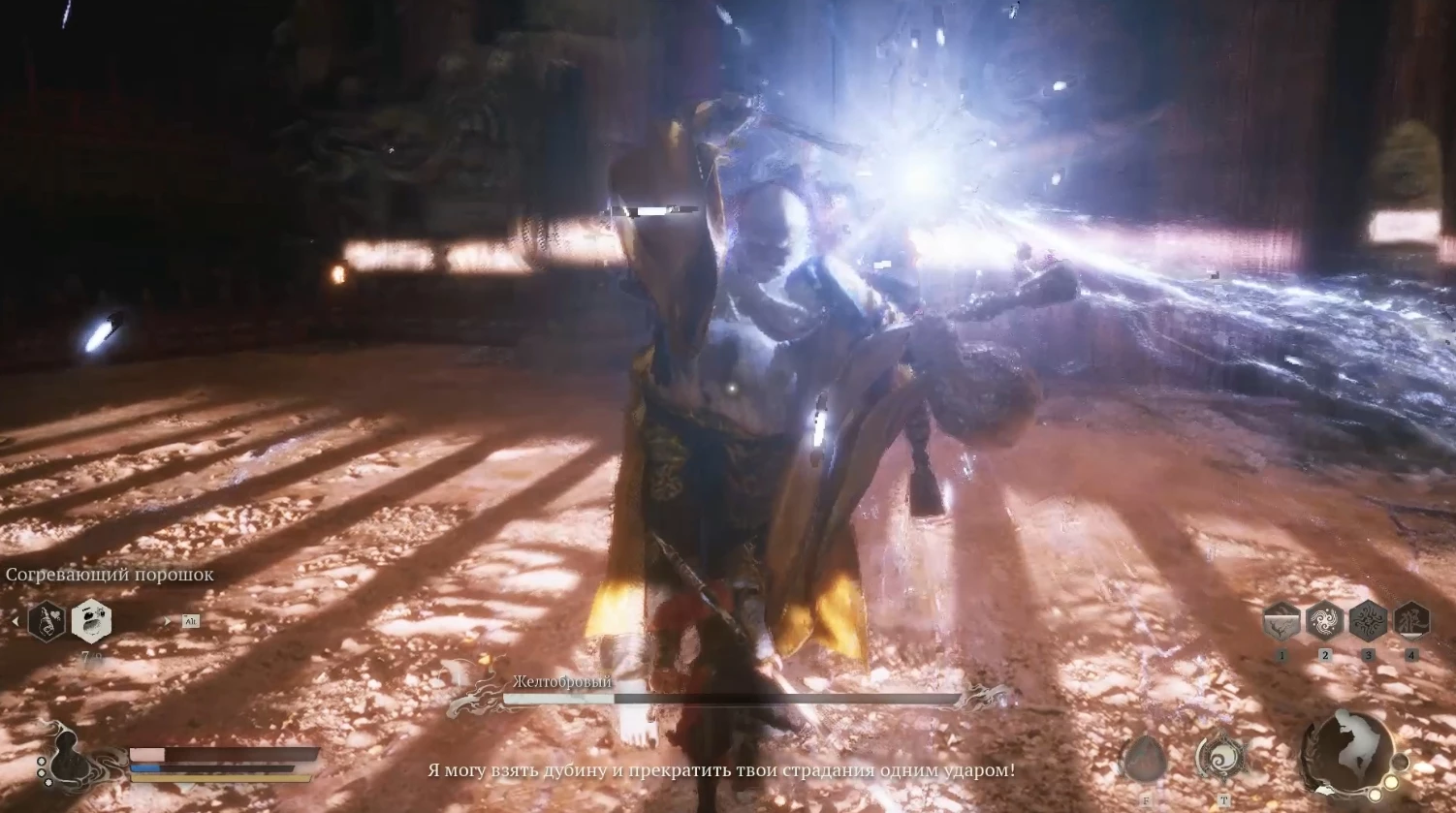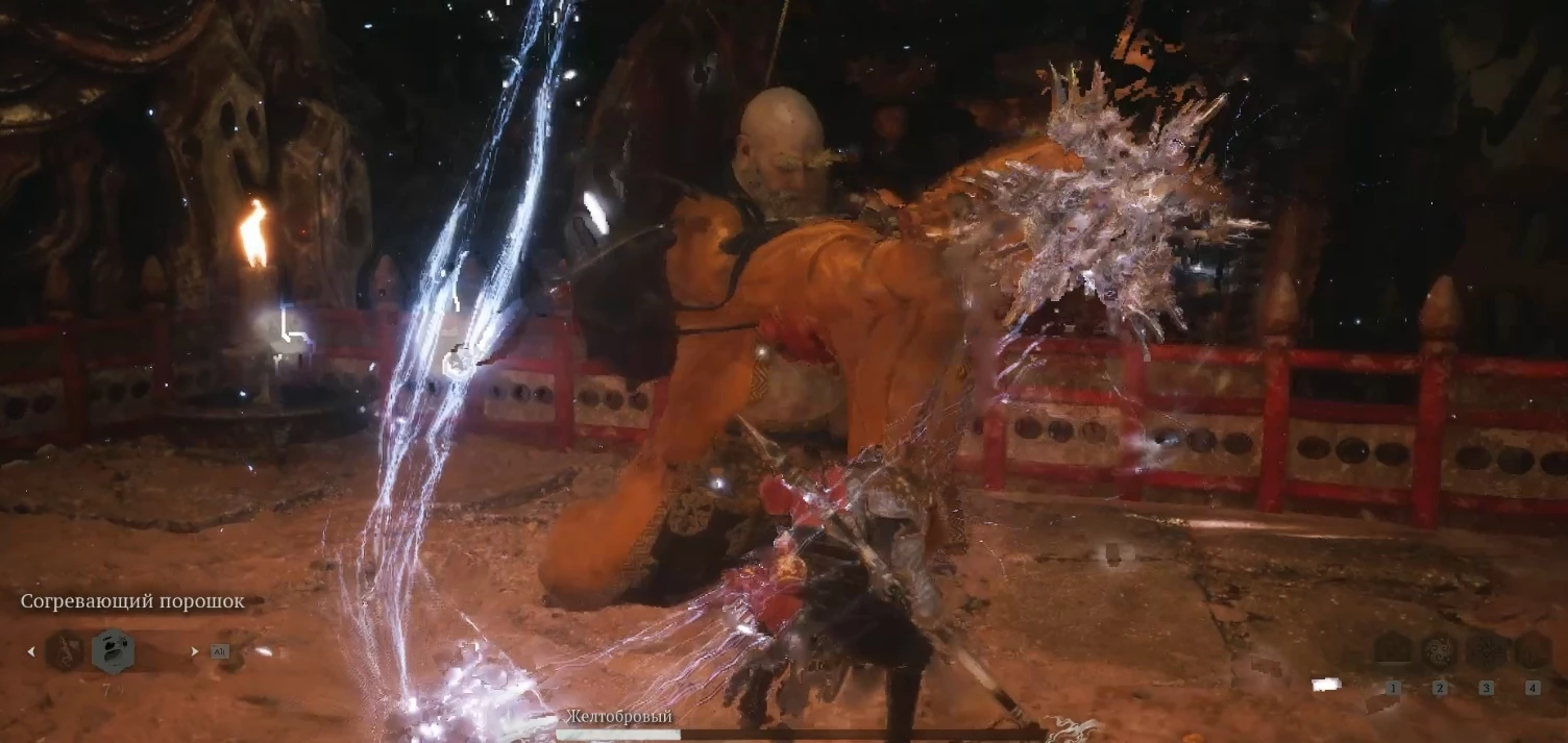 Когда у Желтобрового останется лишь треть здоровья, он вновь применит коварный трюк с вызовом кат-сцены, несправедливо отнимающей у вас множество жизней. Рекомендуем накопить целебное снадобье или использовать восстановительные зелья.