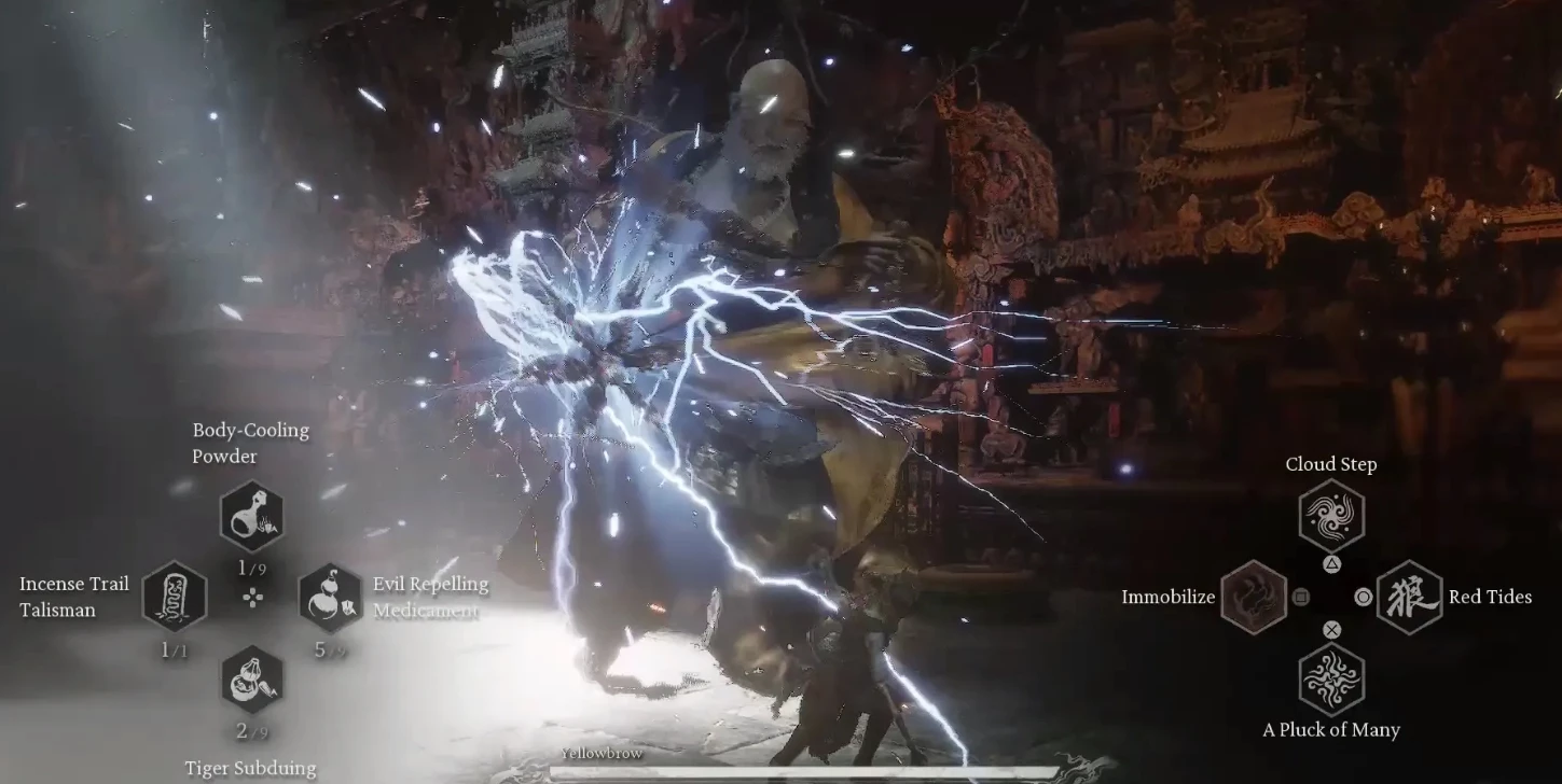Желтобровый использует молнии, способные наложить статус Шока, поэтому имейте при себе Порошок Подавления Шока и увеличьте сопротивление шоку, используя либо броню, либо обменяв Ядра Разума с Собакой Сюй из Главы 2. Он представляет большую угрозу магией, нежели физическими атаками, поэтому стоит заменить Твердую Скалу на Шаг Облака и перераспределить Очки Искры. Хорошая новость в том, что бой состоит из нескольких фаз, отмеченных контрольными точками, что избавляет вас от необходимости начинать всё сначала в случае поражения.