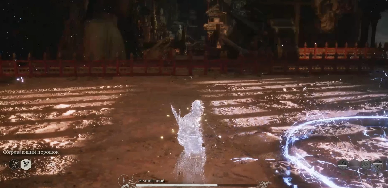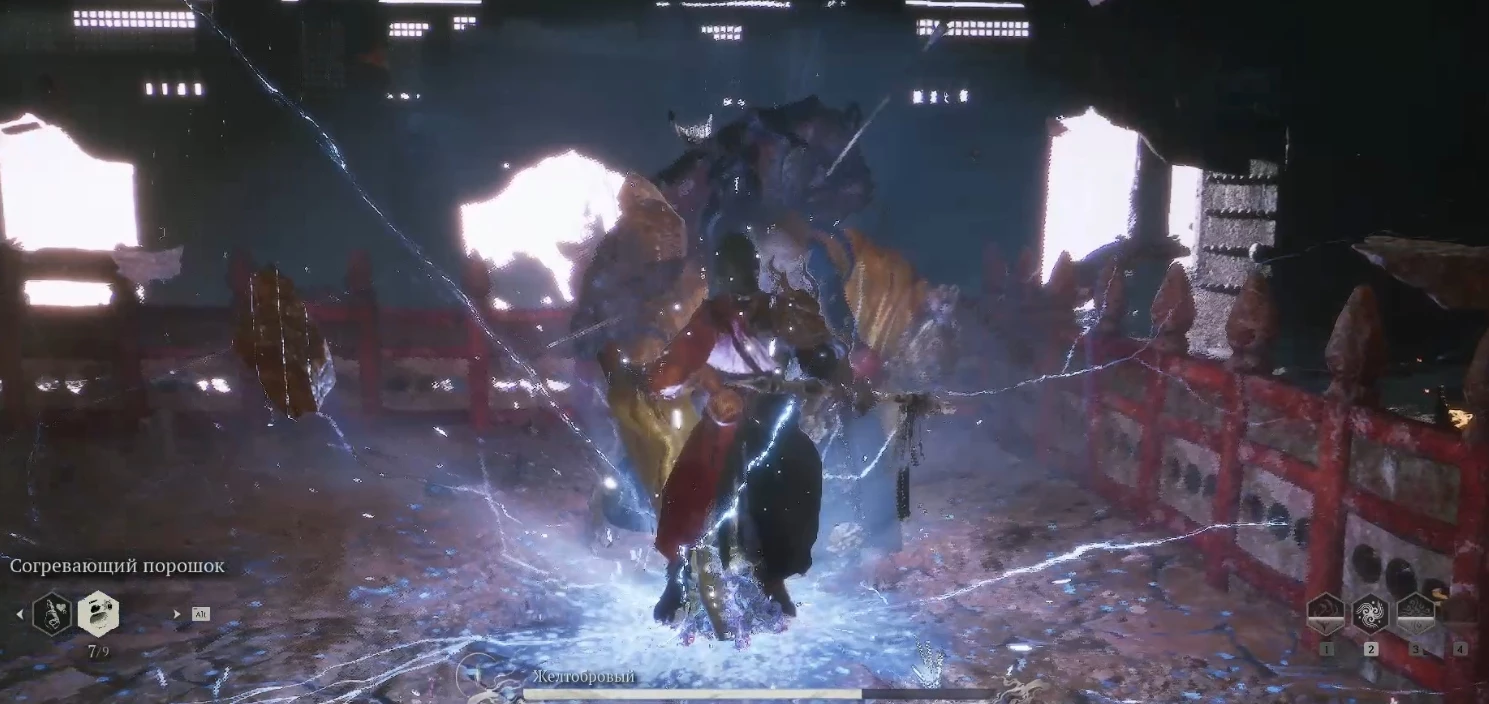 В другом случае он вновь может вызвать электрический разряд, но в этот раз его мощь охватит всю арену. Честно говоря, у меня так и не сложилась ясная стратегия, как избежать повреждений. Возможно, потребуется идеальное уклонение в какой-то конкретный момент анимации, но его определить крайне сложно. В качестве хоть какой-то защиты я просто пользовался паузой перед атакой, чтобы выпить Антишоковый порошок.