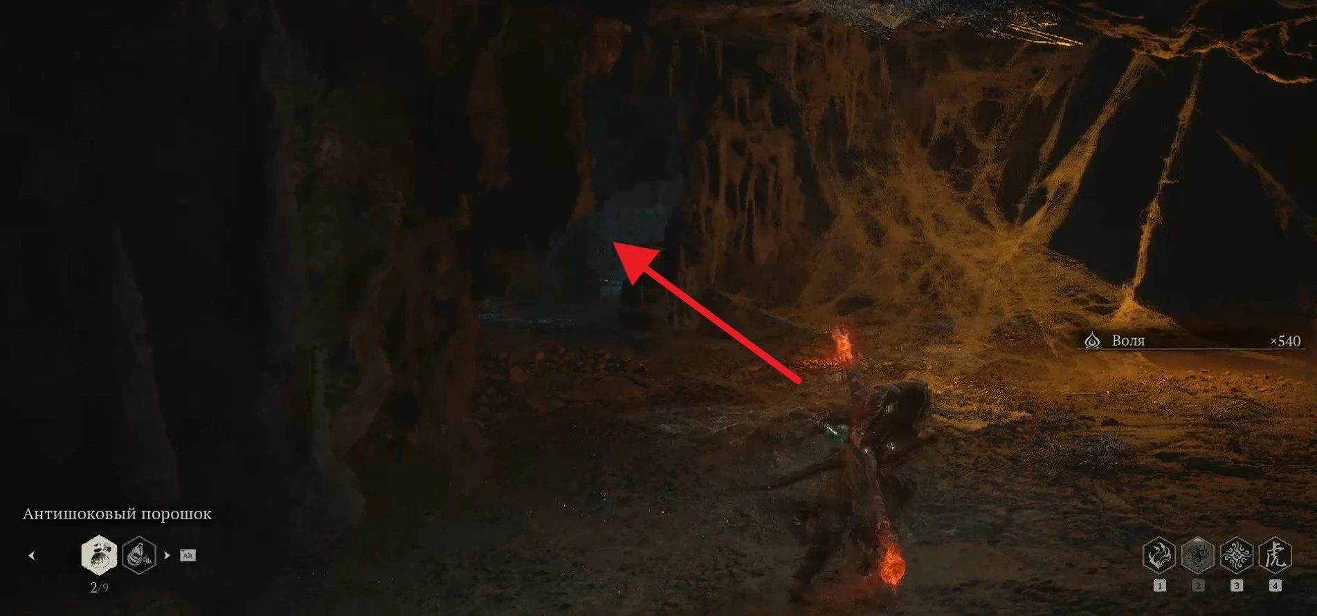 Затем вы окажетесь в другой пещере с коконами, где потребуется сделать поворот влево.