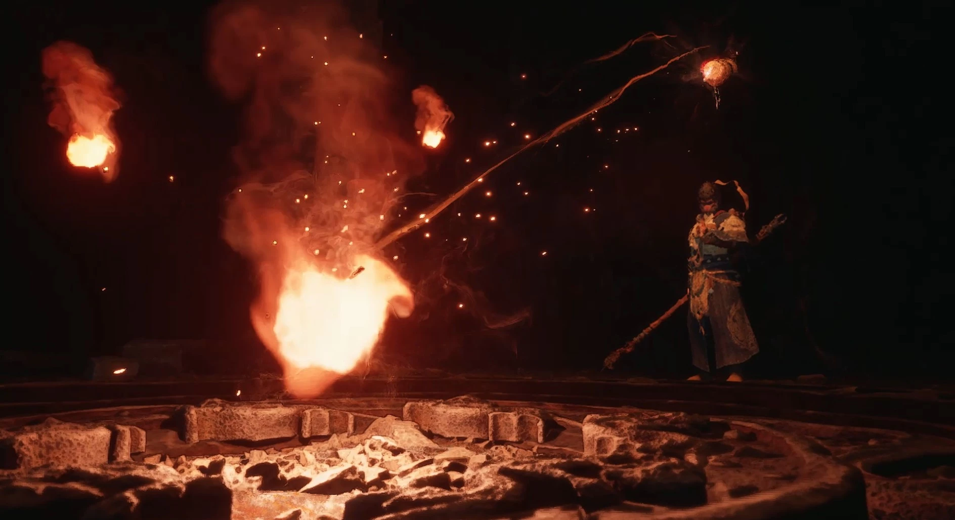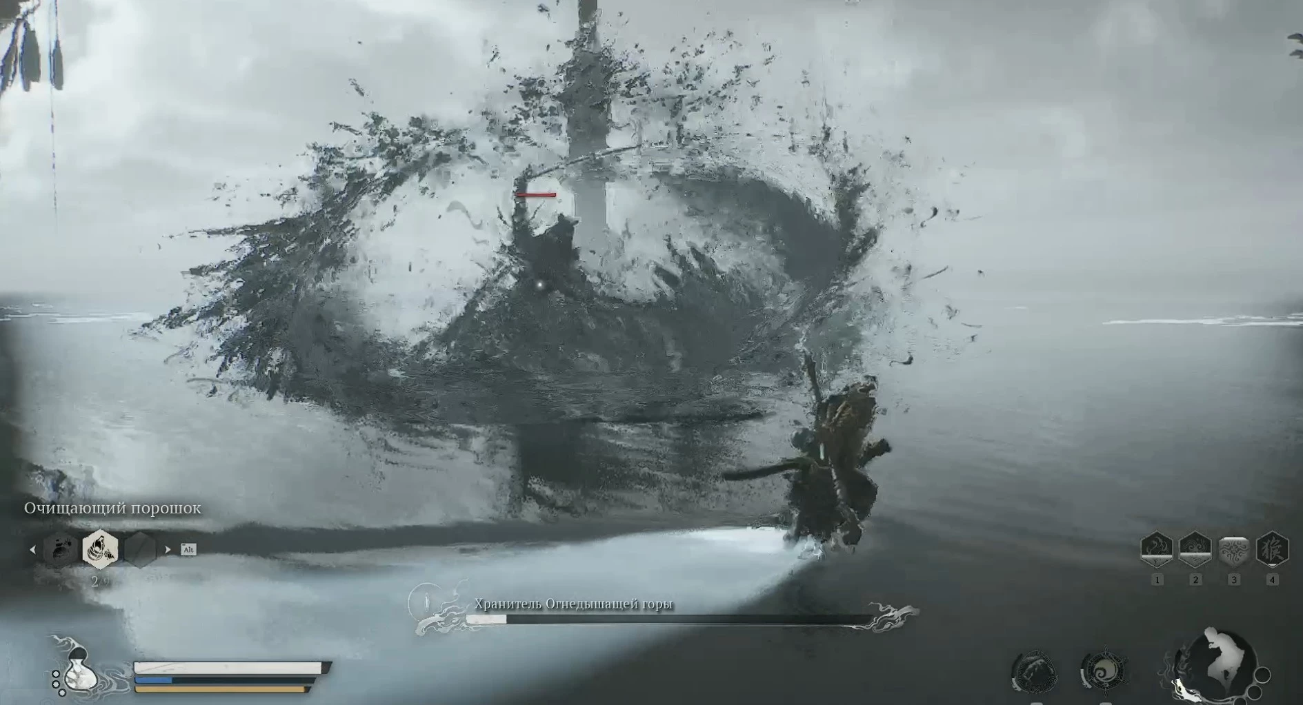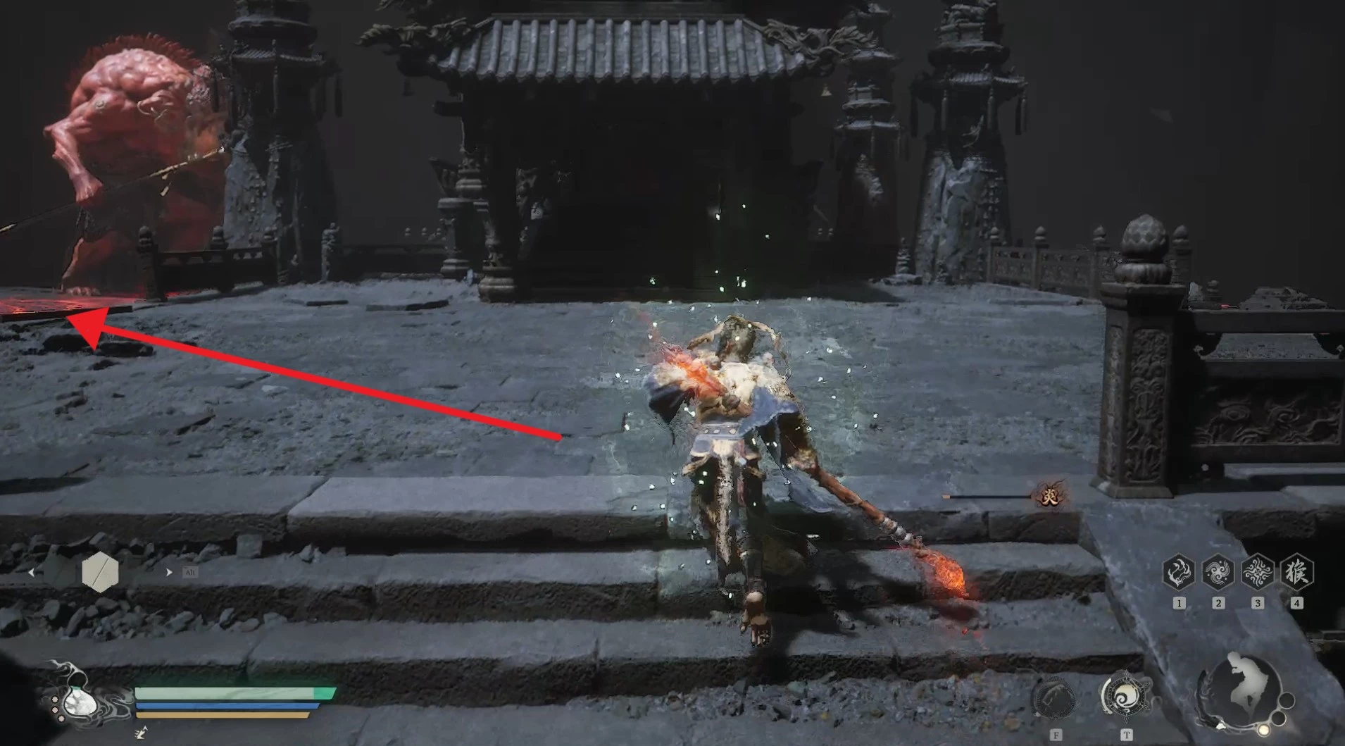 Чтобы сохранить здоровье на данном этапе, лучше не атаковать, а попытаться заманить врага к Чжу Бацзе. Это отвлечет его внимание и даст возможность накопить максимальную концентрацию в Стойке столба, позволяя наносить удары без риска получения урона.