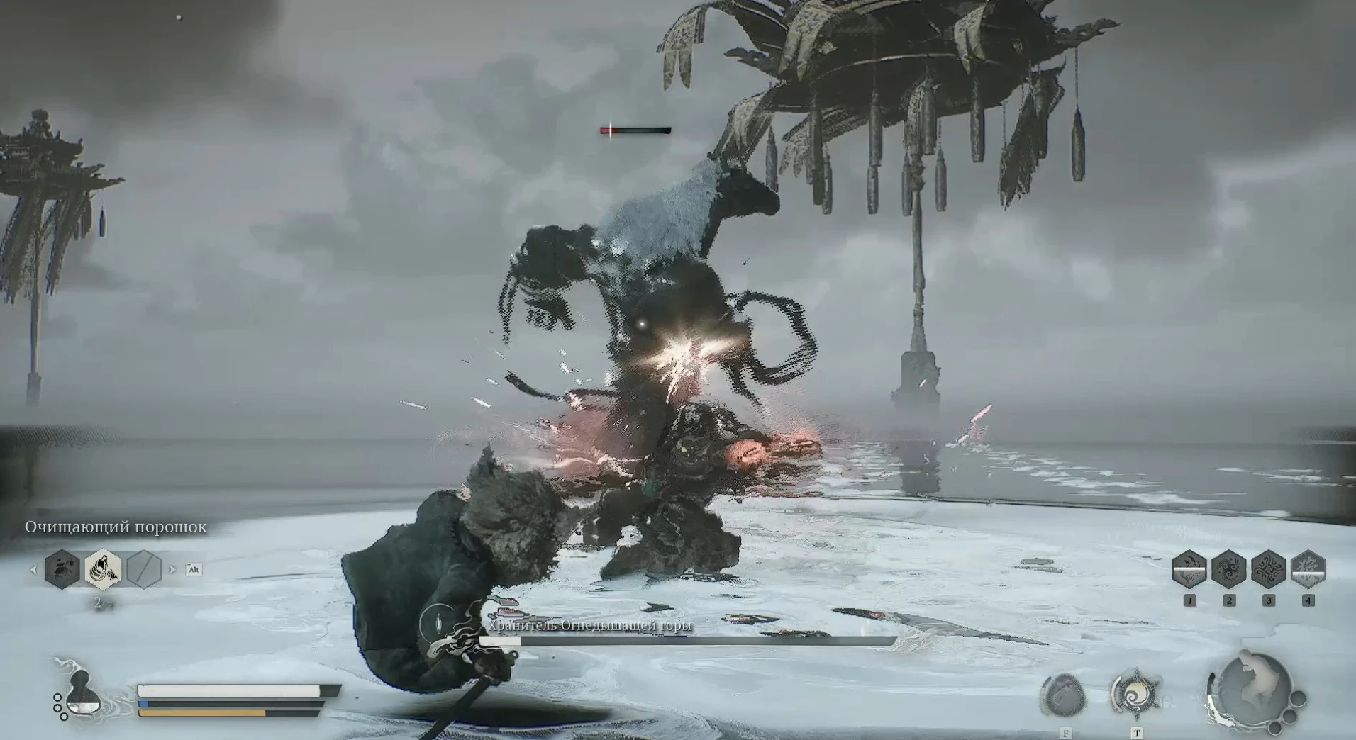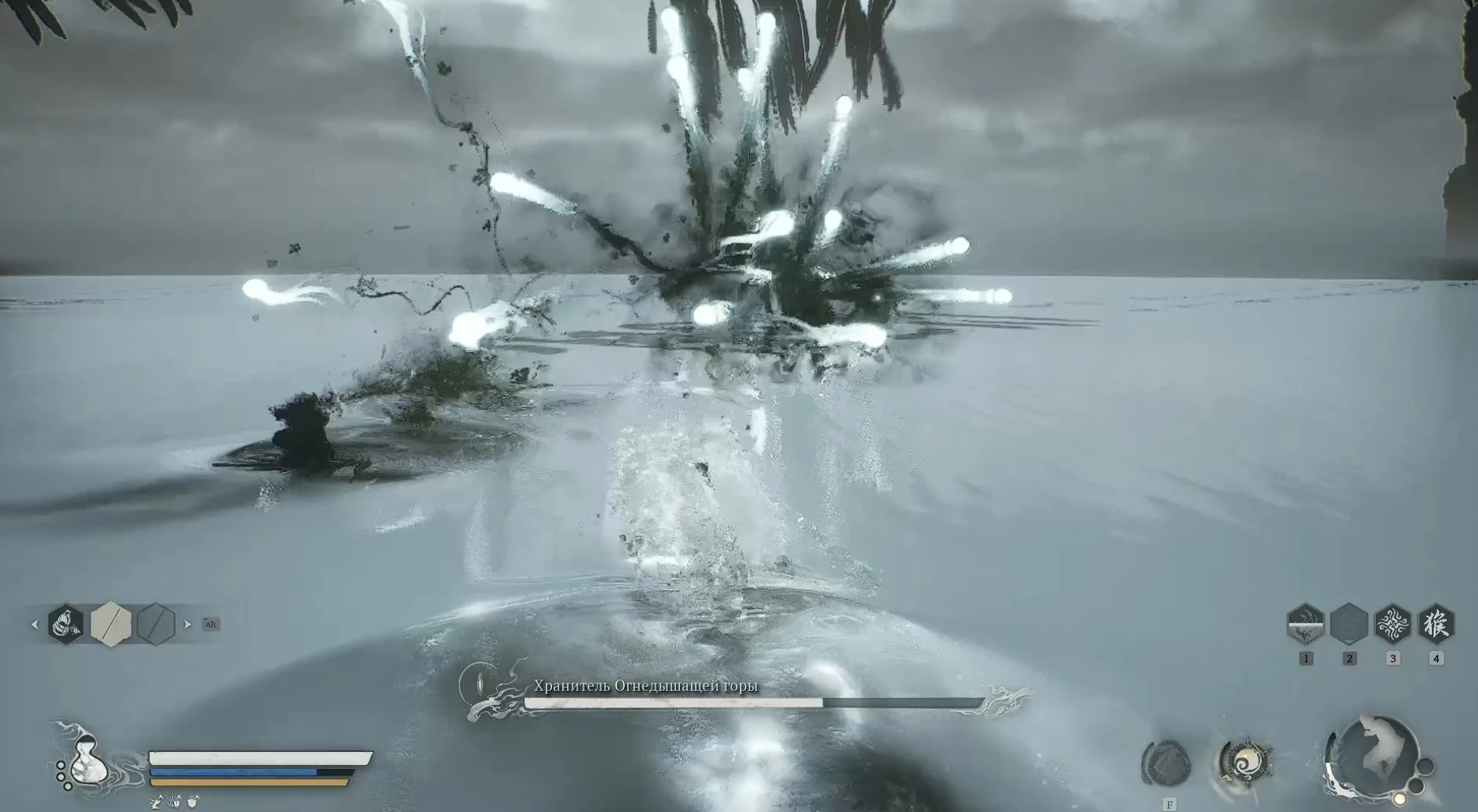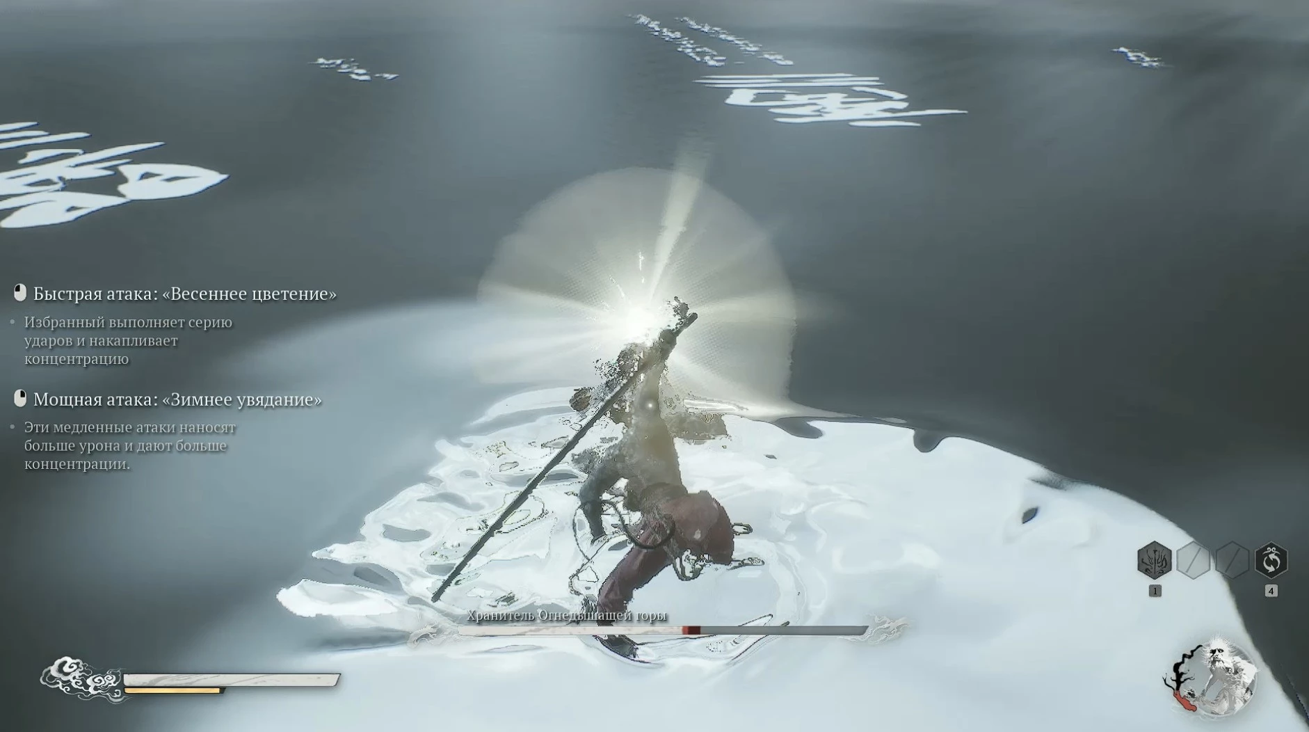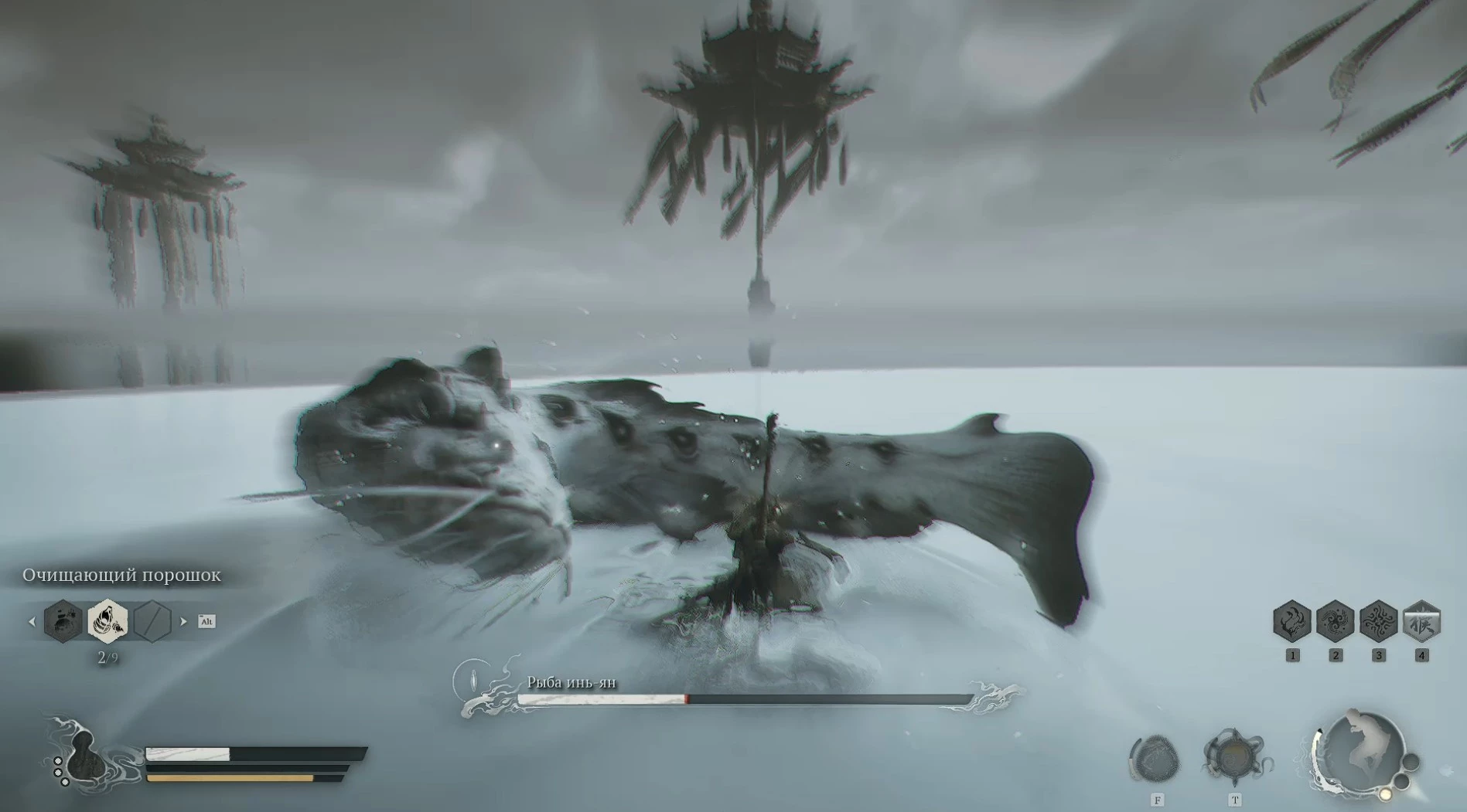 Когда мир вокруг вас окутается белоснежным покровом, рыба начнет проявлять свою активность и агрессию. Однако, несмотря на кажущееся разнообразие, она будет лишь изо всех сил повторять один и тот же набор атак. В этой битве решающими факторами станут настойчивость и терпение; вам придется постоянно уклоняться от её нападений и лишь в редкие моменты врываться в атаку, истощая жизненные силы босса капля за каплей, надеясь дожить до момента, когда восстанавливается ваше заклинание трансформации или накапливается заряд ци для обращения к силе собственных духов.