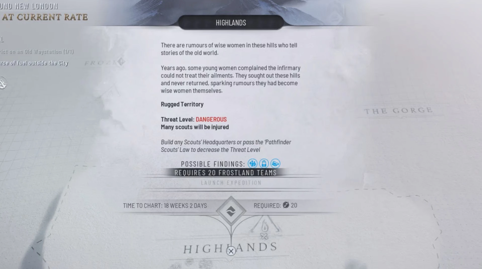 Если регион помечен как опасный или у вас недостаточно разведчиков для исследования, потребуется усовершенствовать свои экспедиции. Это можно сделать, расширив Логистические районы или построив дополнительные структуры вокруг Нового Лондона по аналогичному принципу. Для работы с опасными регионами обязательно постройте Штаб-квартиру разведчиков или примите Закон о разведчиках, позволяющий сделать их безопасными, при условии установки Штаб-квартиры в Логистическом районе.