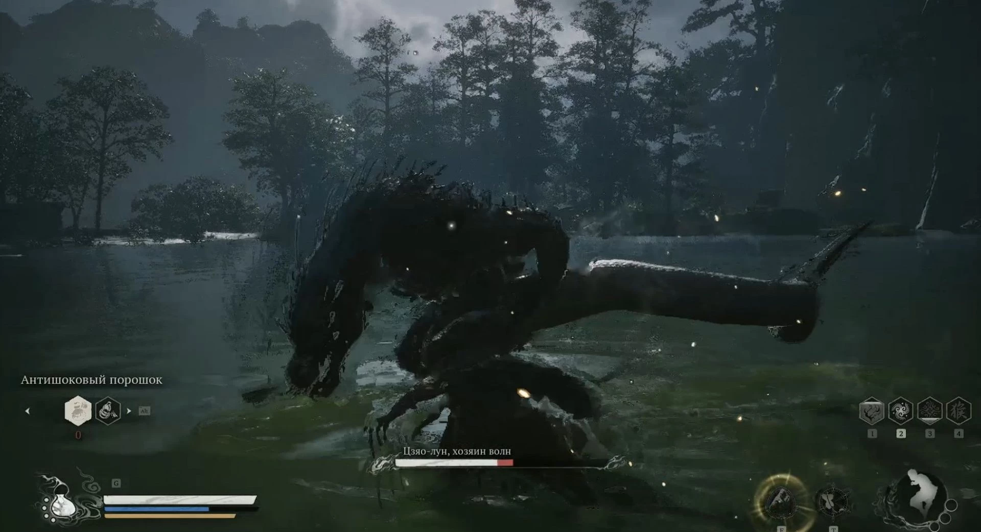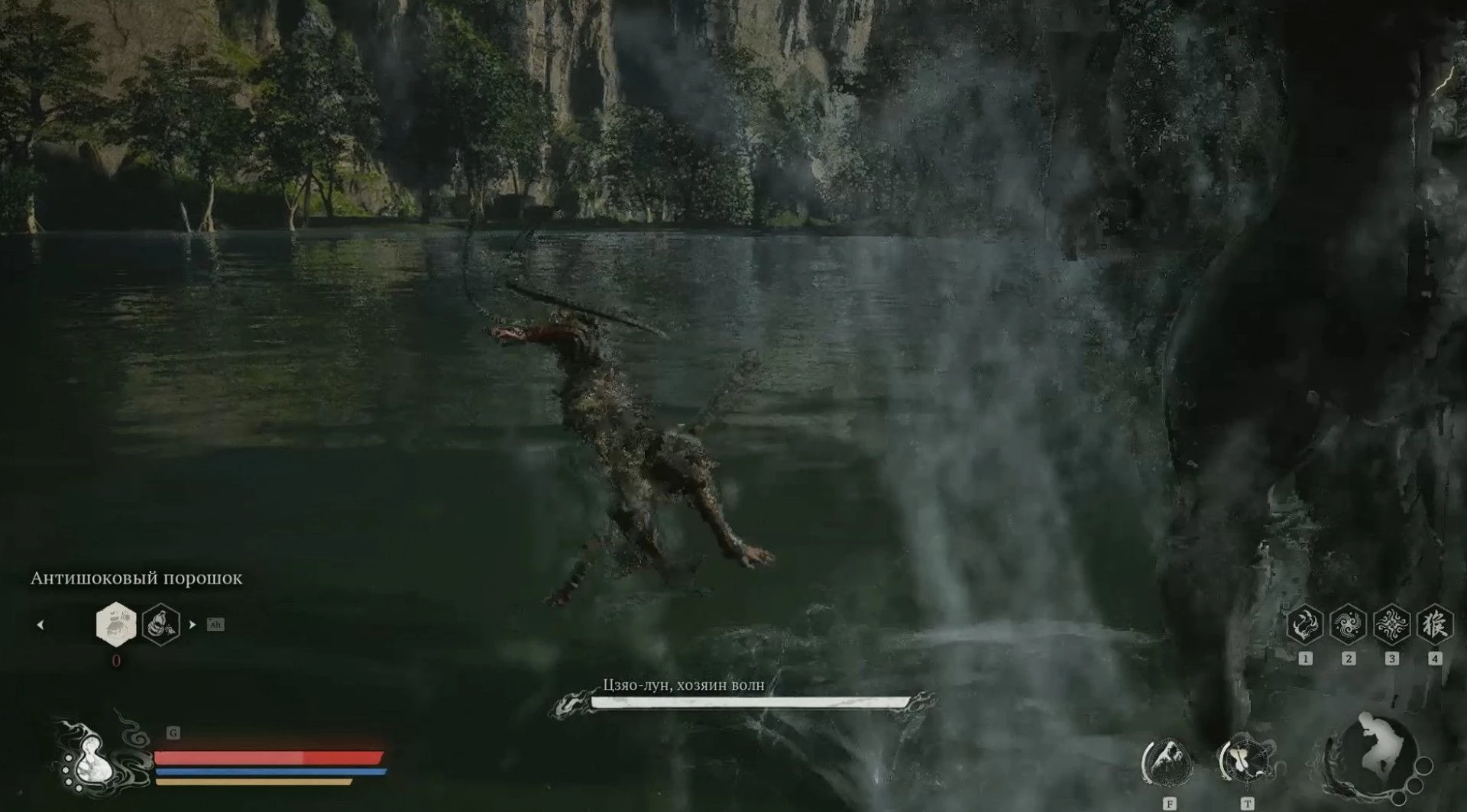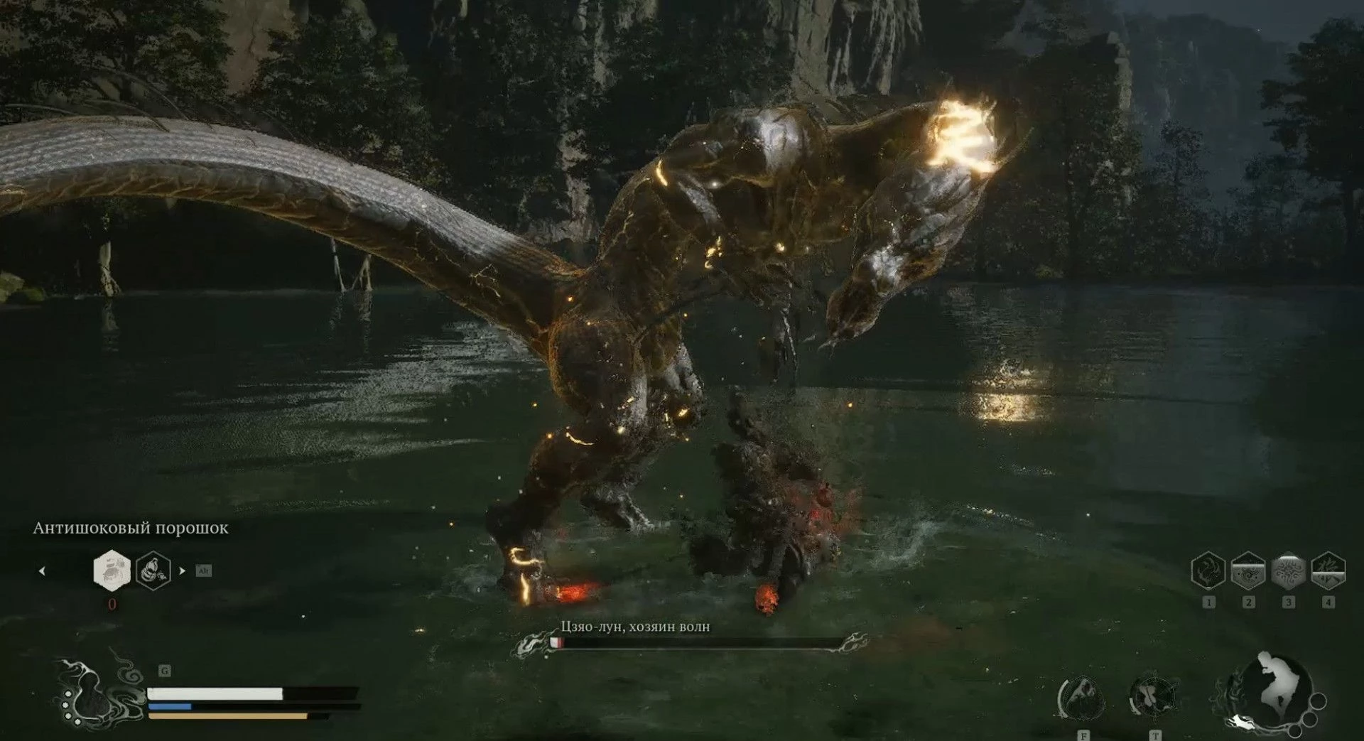 Как только вы ступите на поверхность озера, вам может показаться, что место пустое, пока внезапно не появится Хозяин волн из воды. Этот прием трудно предсказать и он наносит значительный урон, но это всего лишь одна из немногих угрожающих атак Цзяо-луна.
