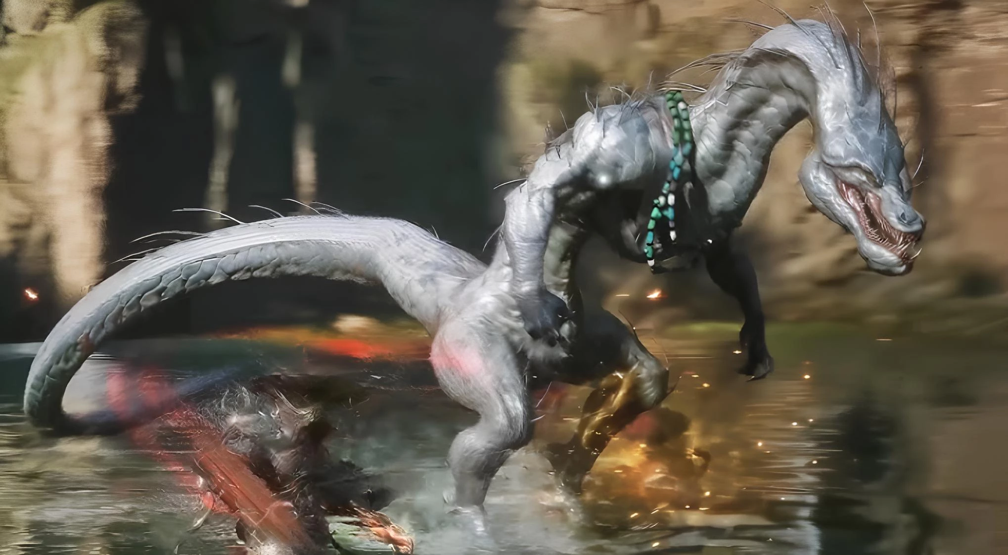 Однако настоящий страх вызывает его хвост, когда босс разворачивается к вам спиной. Увернуться от него необходимо, так как это приводит к непрерывной анимации атаки, в которой вы погружаетесь в зубастую пасть ящера и теряете почти все здоровье.
