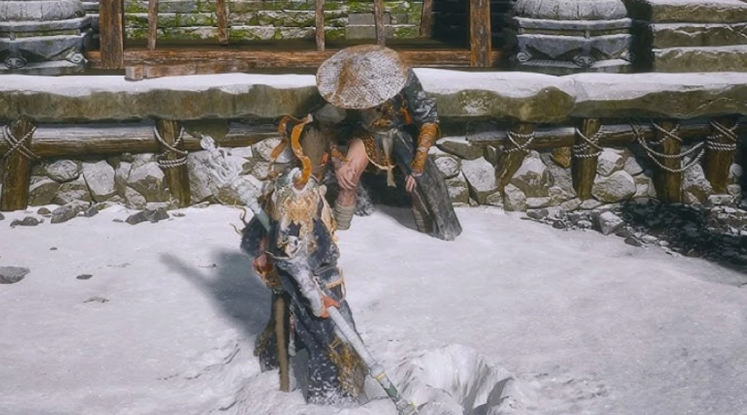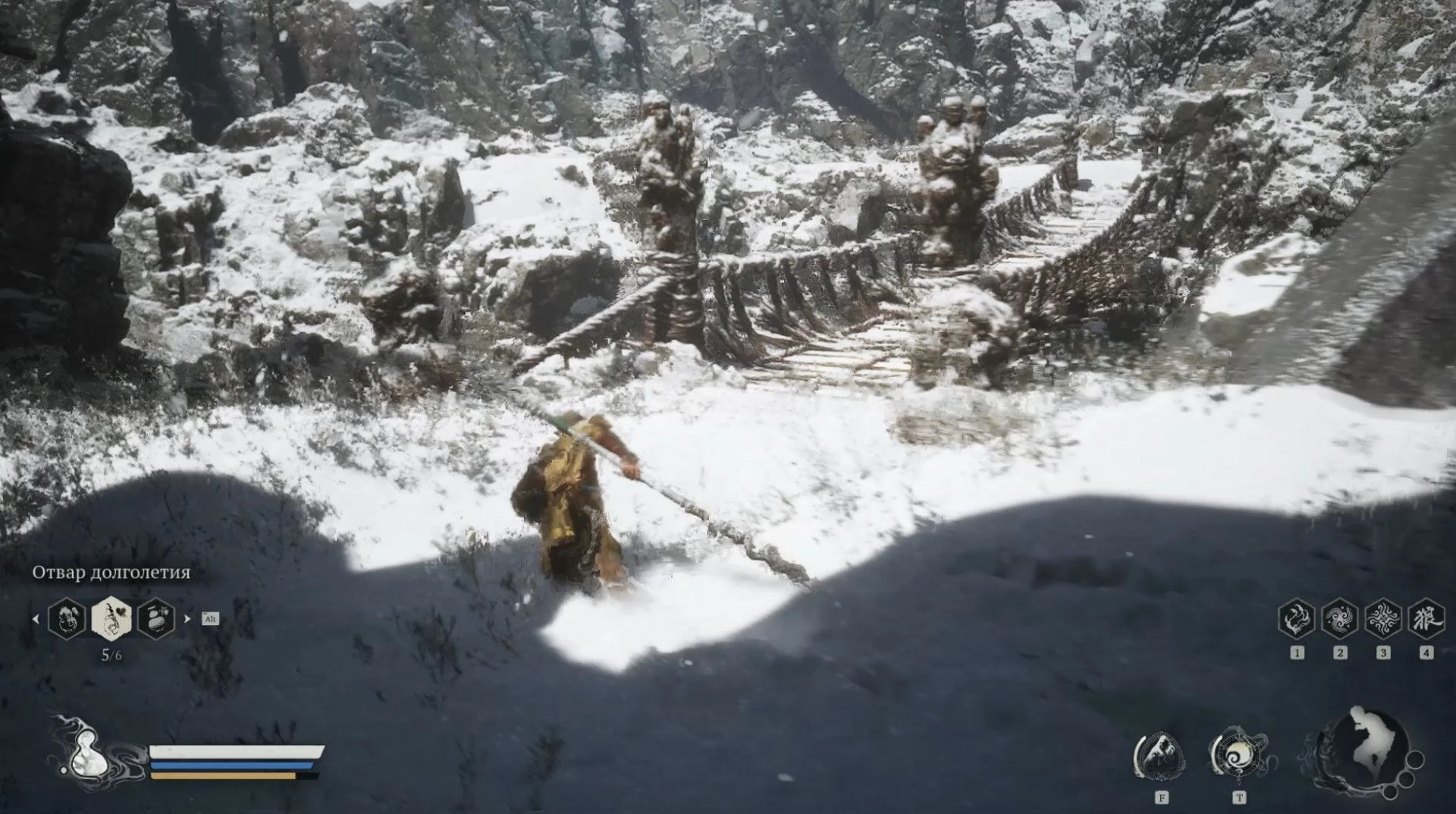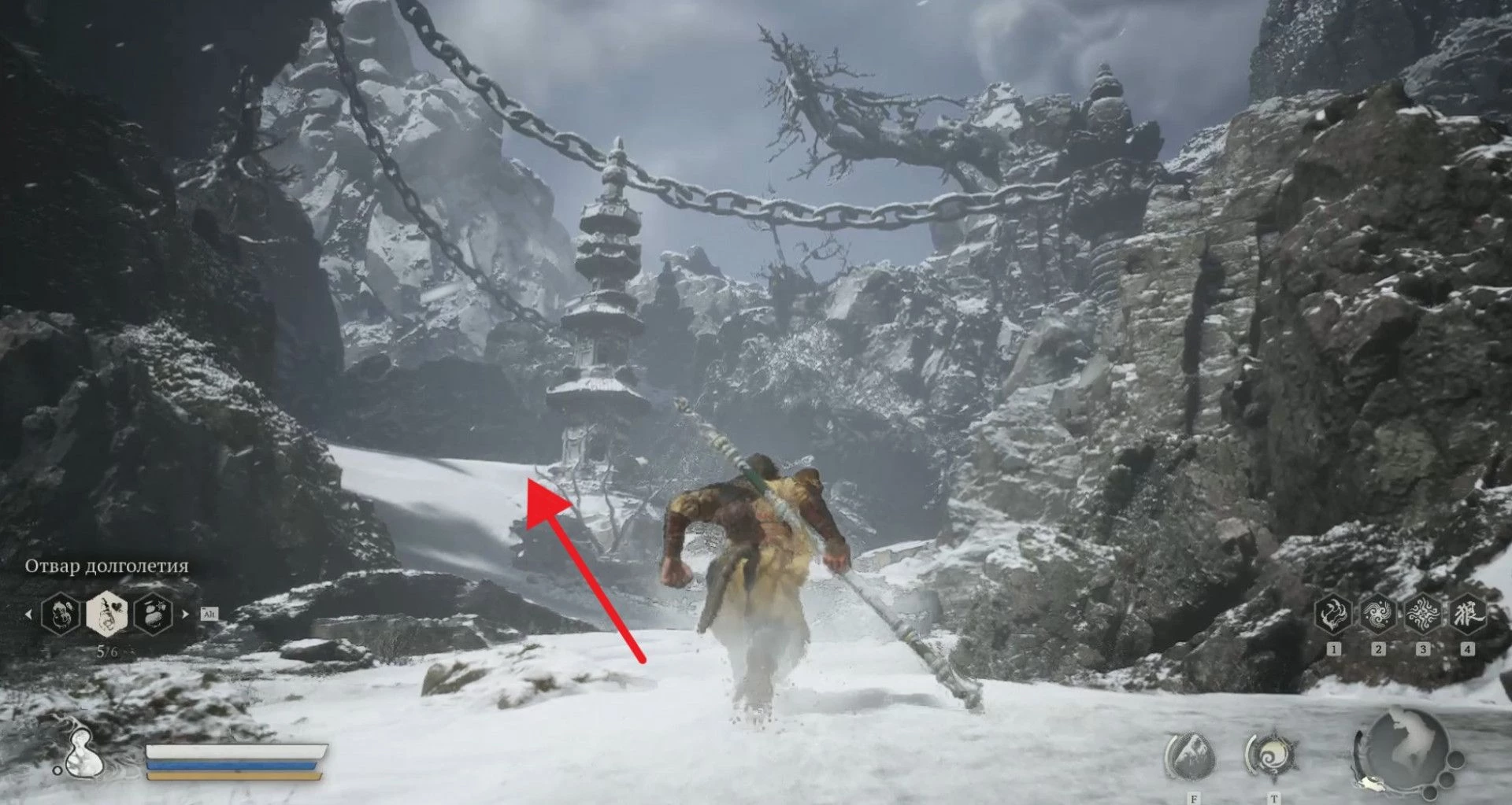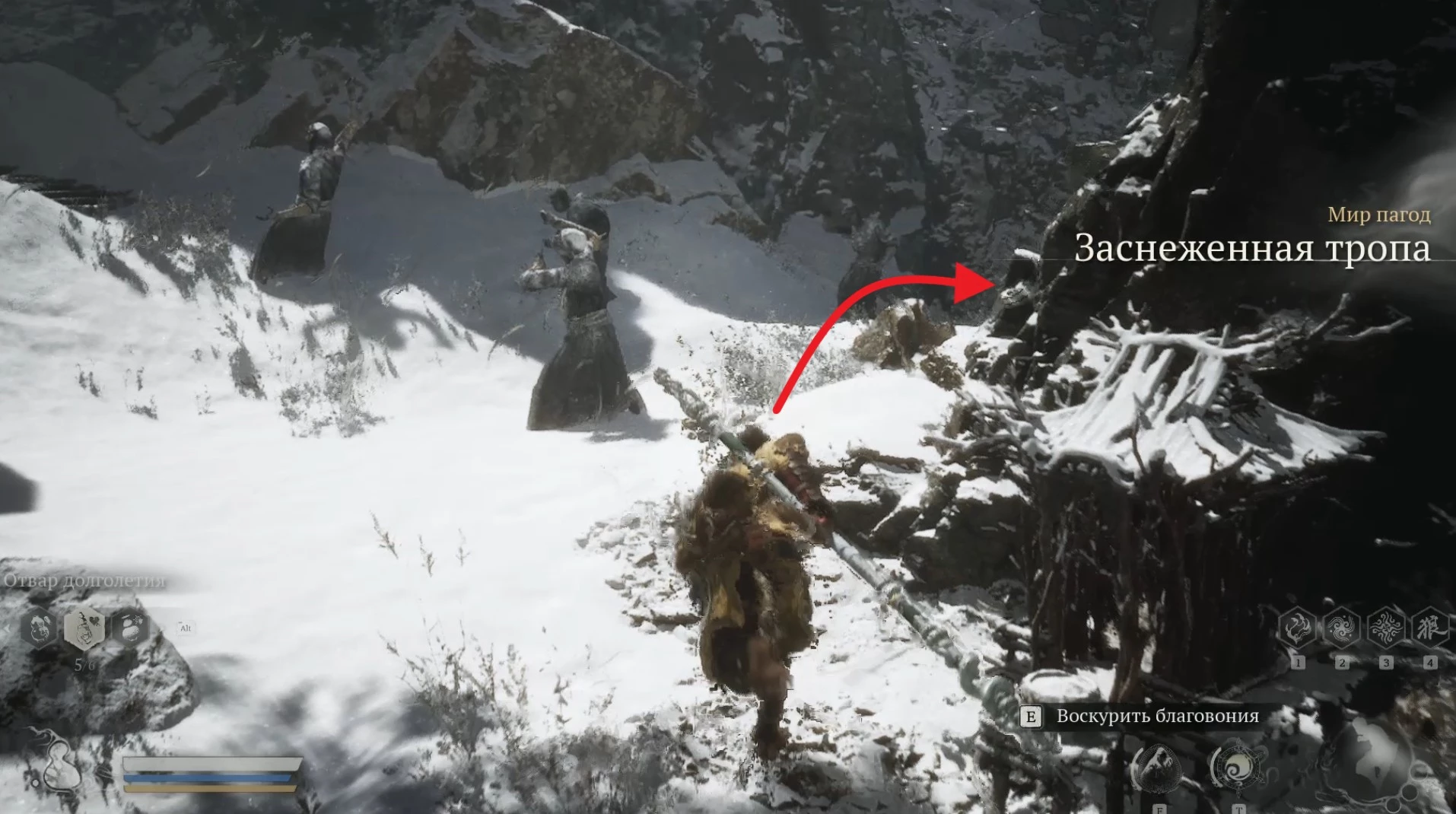 С этого момента вам предстоит продолжить единственным путем к алтарю, известному как Заснеженная тропа. Достигнув его, поверните направо и пересеките деревянный мост.