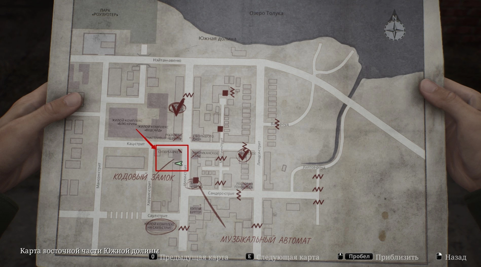 Чтобы найти записку с подсказкой к коду, направляйтесь на юго-восток от бара Neely's по Сандерс-стрит.