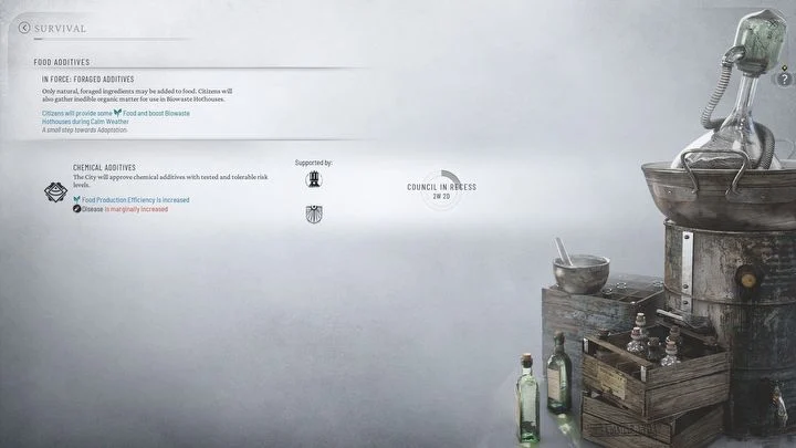 Стабилизация производства продовольствия может стать серьезной проблемой для развивающегося города. В начале игры предложите один из двух законов, связанных с диверсификацией рациона питания ваших граждан. В принципе, оба варианта, Chemical и Foraged, довольно хороши и должны привести к быстрому улучшению ваших продовольственных запасов. Принимая это решение, учитывайте, как именно вы хотите развивать свой город .