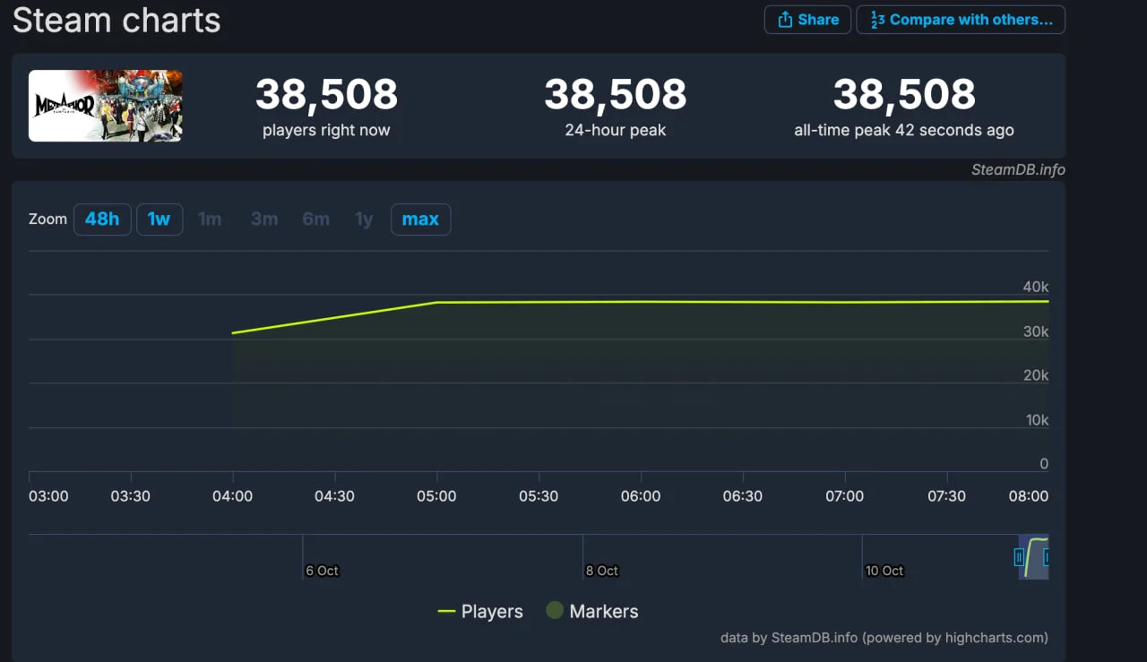 На данный момент количество игроков составляет 38508 человек, и, вероятно, эти цифры возрастут в выходные. Игра уже получила «Очень положительные» отзывы, с рейтингом одобрения 87% на основе 488 рецензий. Игроки отмечают, что Metaphor: ReFantazio во многом напоминает Persona, но также обладает уникальными особенностями, что может заинтересовать поклонников JRPG.