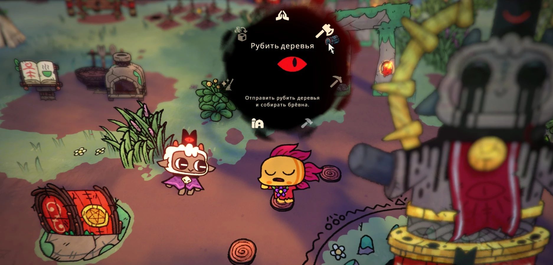Наиболее очевидным и простым способом получения бревен является рубка деревьев внутри поселения. На начальных этапах, пока у вас нет последователей, вам предстоит делать это самостоятельно. Однако это всего лишь временная мера — когда вы привлечете первых культистов, подойдите к ним и в меню взаимодействия выберите функцию «Дать работу — Рубить деревья».