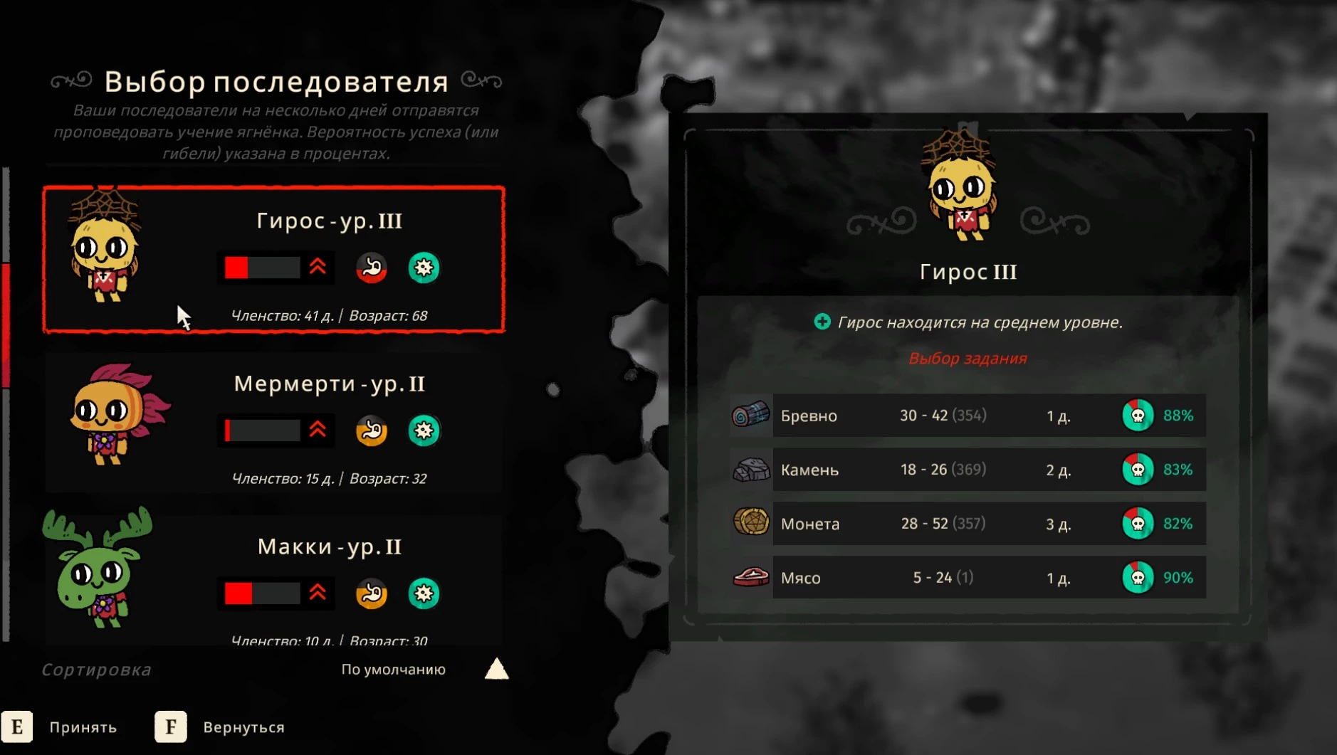 Еще один способ собирать древесину — направить своих подопечных в бескрайние походы за ней. Для этого необходимо открыть и возвести Домик миссионера. Подойдя к этому священному месту, выберите культиста, которого хотите отправить в странствие, и назначьте ему миссию по добыче бревен. В меню Домика, при наведении на каждого последователя, отображается вероятность успеха в процентах для каждой конкретной миссии.