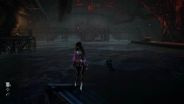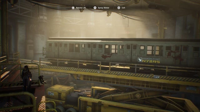 Перейдите к центральной платформе, найдите открытую дверь справа от строительных лесов, где вас ждут две тележки. Разместите их на нажимные пластины. Наконец, направьтесь к правой платформе, где, рядом со сломанным автобусом, спрятаны ещё две тележки. Разместите их на верхних прижимных пластинах. Теперь используйте терминал за правыми ставнями, и они поднимутся, открывая доступ к гаражу с контейнером.
