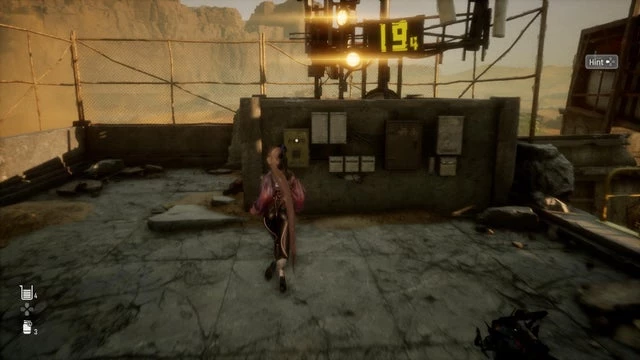Таким образом, действовать нужно быстро. Когда будете готовы, нажмите на первый распределительный щиток и затем прыгните на перекладины, выступающие из неподалёку стоящих столбов. Переместитесь по двум столбам, а затем прыжком перескочите на перекладины, что перпендикулярно им. Используйте эти поручни, чтобы добраться до ещё одной пары столбов слева, пересеките их и прыгните на лестницу впереди. Поднимитесь по лестнице, и, достигнув вершины, увидите второй распределительный щиток. Взаимодействуйте с ним и двигайтесь вправо.