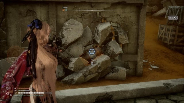 Затерянный среди погребённых руин, неподалёку от лагеря легиона «К северу от погребённых руин» в Великой пустыне, ищите ящик, полный тайны. Начните своё путешествие у отмеченного на карте места, где мерцает неоновая вывеска со стрелкой, устремлённой ввысь, рядом с жёлтой лестницей, доступной с крыши заброшенного автобуса. Поднимитесь на вершину, затем прыгните на здание слева и продолжайте свой путь на следующую крышу. Здесь вас встретят качели и жёлтый столб, стоящий между текущим зданием и постройкой слева. Перед вами, словно светлый знак, появится передвижной оранжевый ящик. Схватите этот контейнер и направьтесь к качелям — на сторону, противоположную столбу.