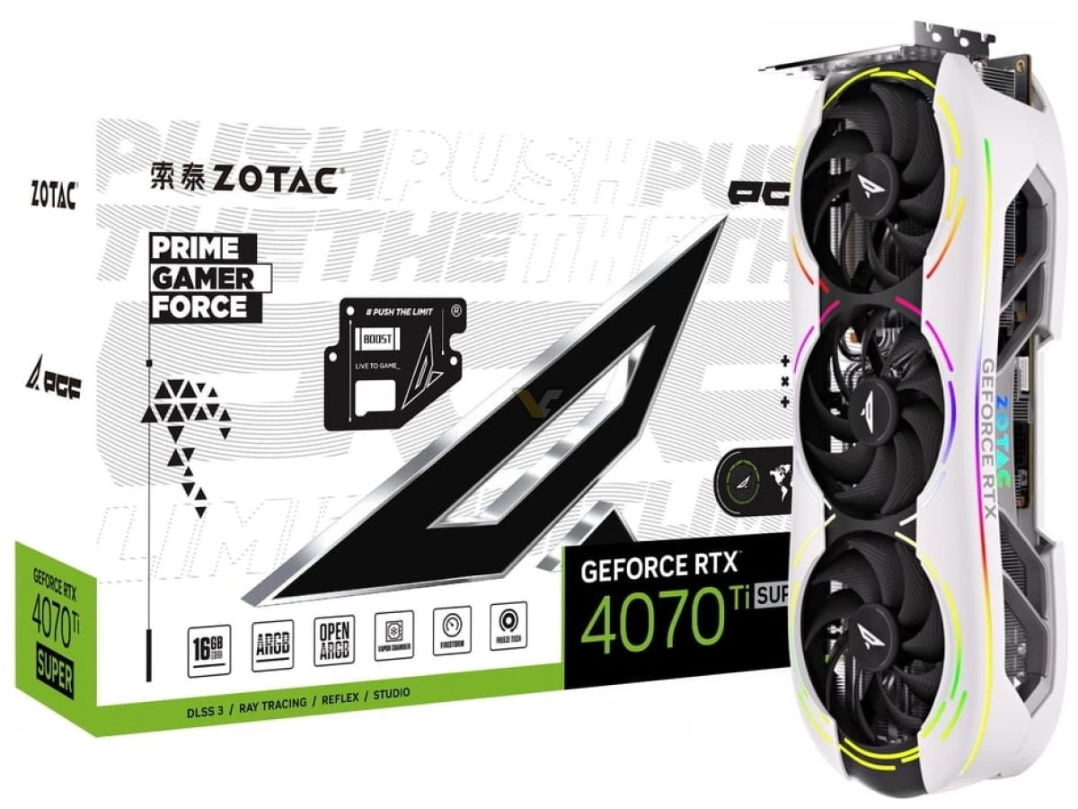 Компания ZOTAC анонсировала две новые видеокарты GeForce RTX 4070 Ti SUPER — PGF OC и AMP Extreme, основанные на усеченной версии графического процессора NVIDIA Ada Lovelace. Обе модели обладают схожими характеристиками, включая графический чип AD102-175 с 8448 ядрами CUDA и 16 ГБ видеопамяти GDDR6X на 256-битной шине. Тепловая мощность в 285 Вт обеспечивается через 16-контактный разъем питания.