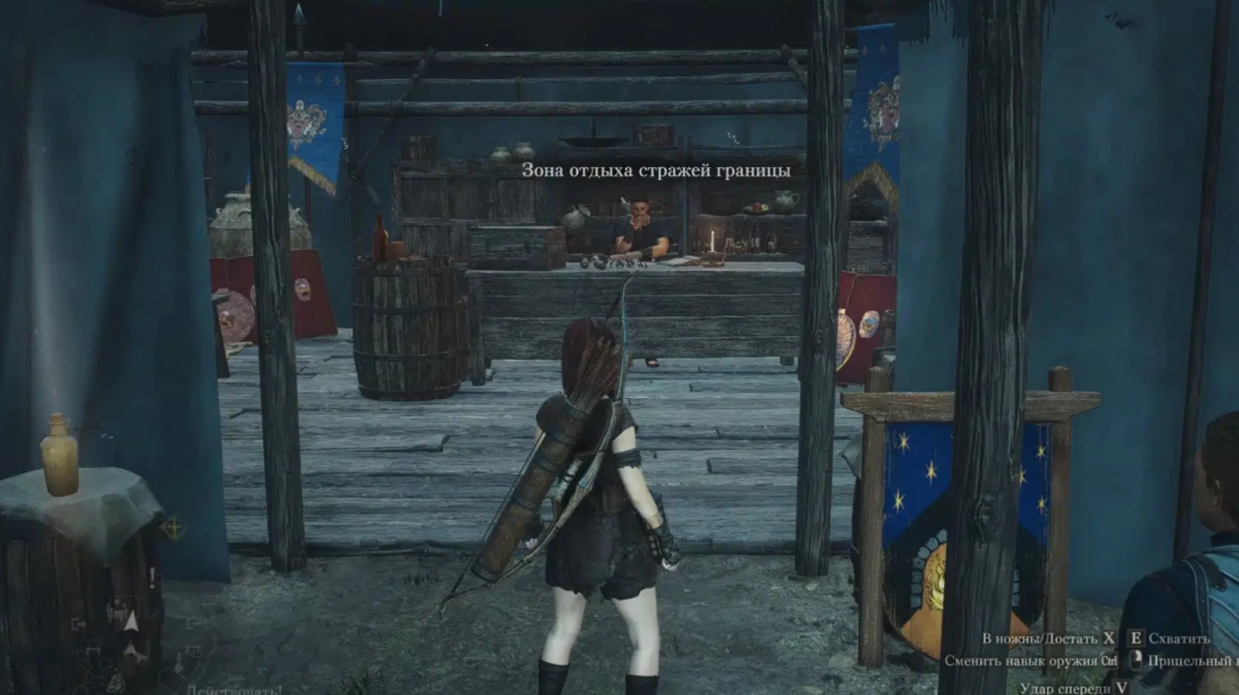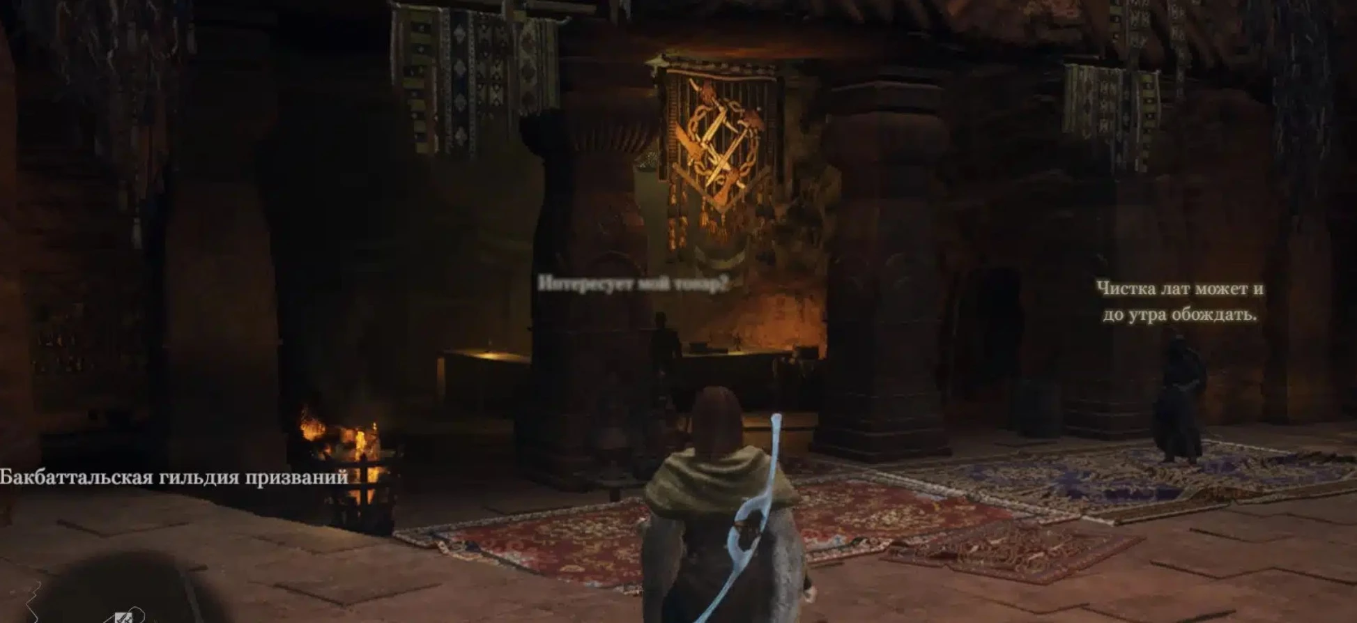 На месте вас встретит яркая синяя палатка, исполняющая роль уютного магазина и таверны. За прилавком стоит Уоррик — добродушный хозяин, у которого после отдыха возможно будет расспросить о гильдии призваний, что откроет вам тайны механики смены класса.