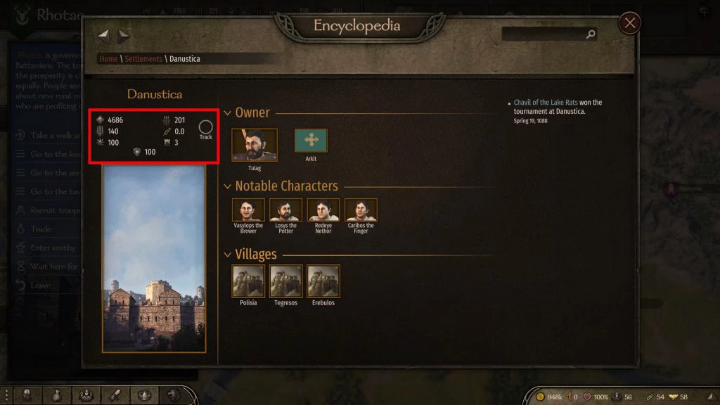 Если у вас есть такой рейтинг в городе или замке, то вы сможете увидеть его в верхней части экрана города, где находится статистика. Он будет указан рядом со значком кинжала. Вы также можете увидеть ту же информацию в энциклопедической записи этого места, непосредственно под названием. Наконец, если охранники не позволят вам войти в какое-либо место, наведение курсора на серую опцию покажет, связано ли это с вашим разыскиваемым преступным статусом.