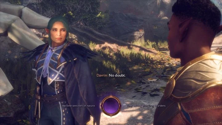 Продолжайте идти по лесной дорожке. Достигнув места назначения, вас вновь ждет разговор с Даврином. Вы сможете выбрать кокетливый ответ, что обозначается сердечком, если намереваетесь завести роман с Серым Стражем. После завершения беседы квест будет окончен.