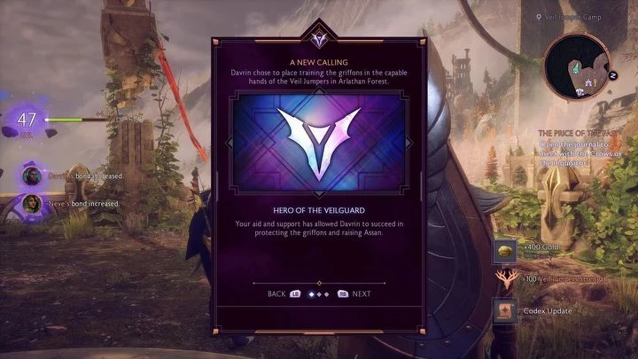 Отправка грифонов к Серым Стражам повысит боевую эффективность Даврина — он получит новое умение и легендарную броню, сокращающую время восстановления способностей, временно делая его неуязвимым и способным поджигать врагов. Если грифоны останутся в Арлатанском лесу, Даврин станет лучше справляться с противниками — он приобретет навык и легендарную броню, увеличивающие урон его способностей и добавляющие Точность, а также улучшат оглушающее воздействие при использовании взрывов. Это завершит сюжетную линию Даврина, и спутник станет Героем Страж Завесы — его новое звание даст ему возможность более успешно выполнить последующее задание в предпоследней сюжетной миссии.