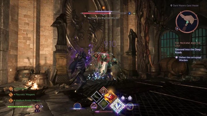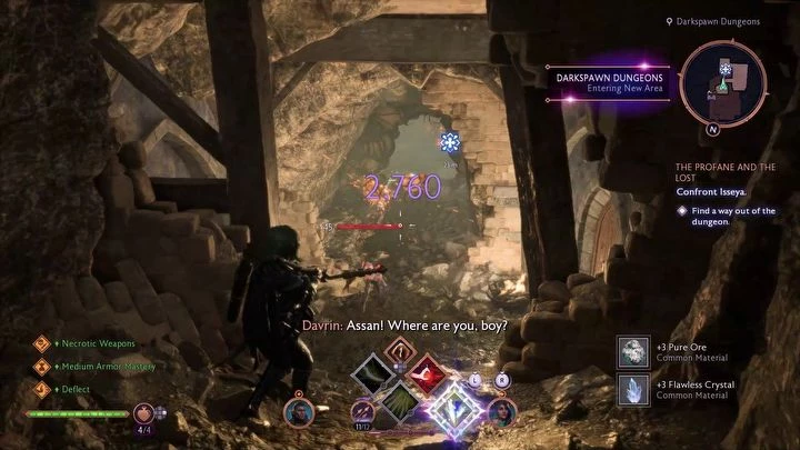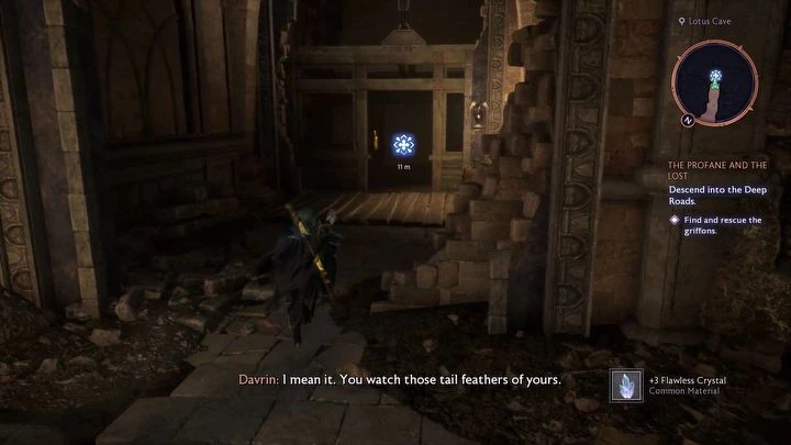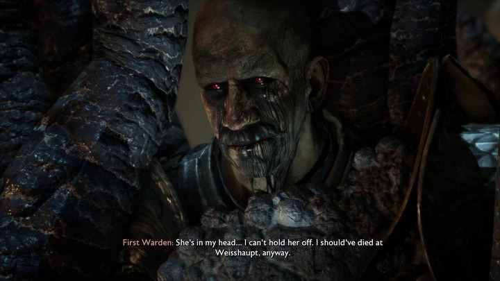 В следующем помещении вы встретите оскверненного Первого Стража — Даврин освободит его от страданий. Если вы убедили его помочь вам во время квеста Осада Вейсхаупта, Первый Страж расскажет вам о слабостях Иссеи. Не забудьте собрать перо, которое находится на столе рядом с Первым Стражем, прежде чем продолжить путь. Спуститесь дальше в подземелье, сражаясь с Порождениями Тьмы.