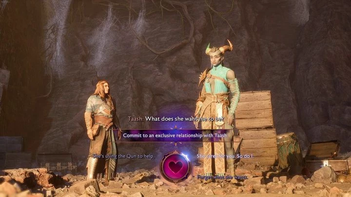 Если вы установили отношения с ним на предыдущих этапах и выбрали романтические варианты, Тааш начнет флиртовать с вами. Когда он спросит ваше мнение по этому поводу, у вас есть несколько вариантов: