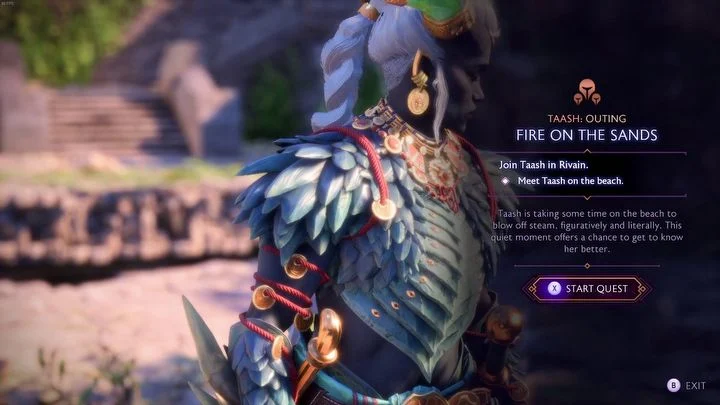 При первой беседе с Таашем у вас будет возможность выбрать романтический диалог. Задания компаньонов - отличный способ углубить ваши отношения. Используйте этот момент, если хотите развивать романтическую связь с воином.