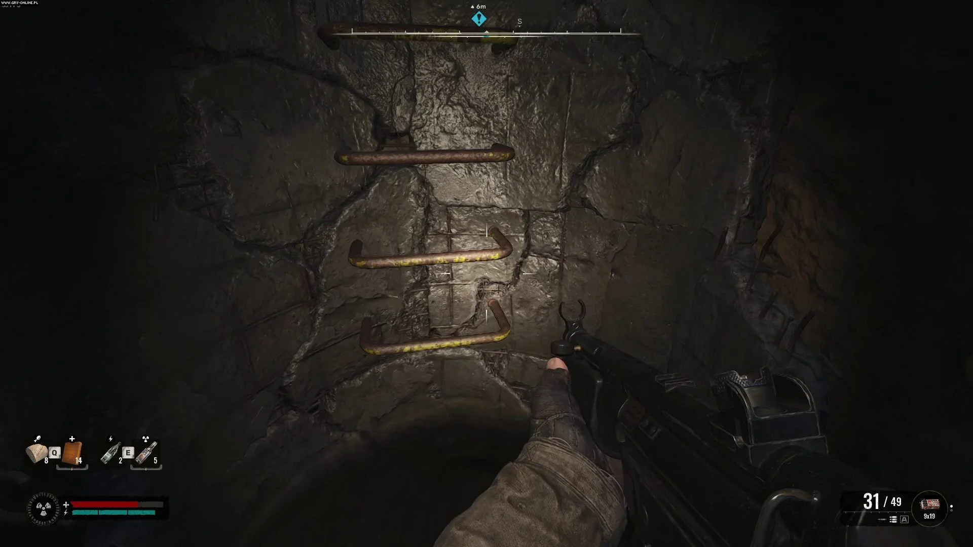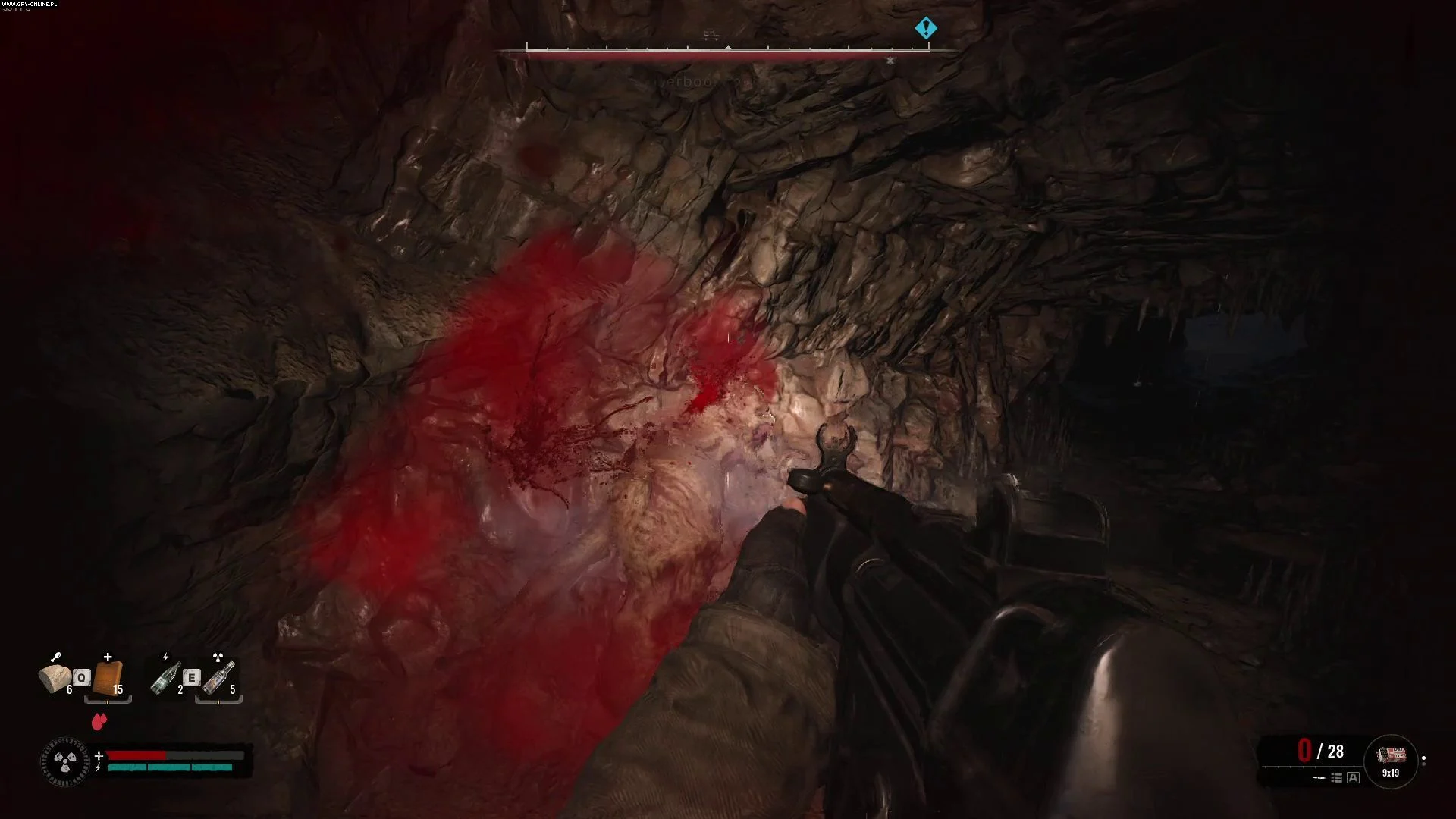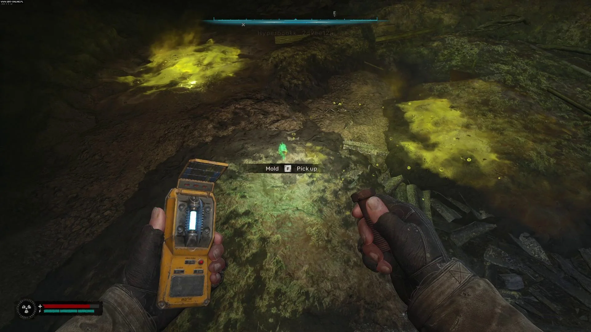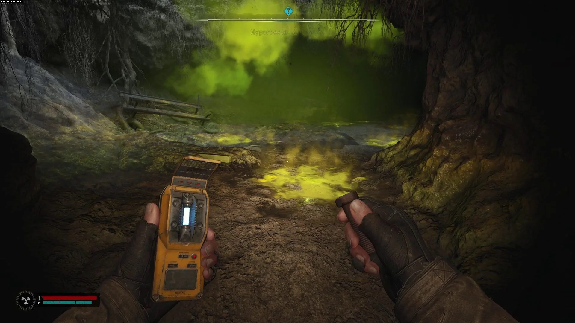 После победы над мутантом двигайтесь дальше вглубь пещеры, пока не найдете комнату, заполненную токсичными лужами.