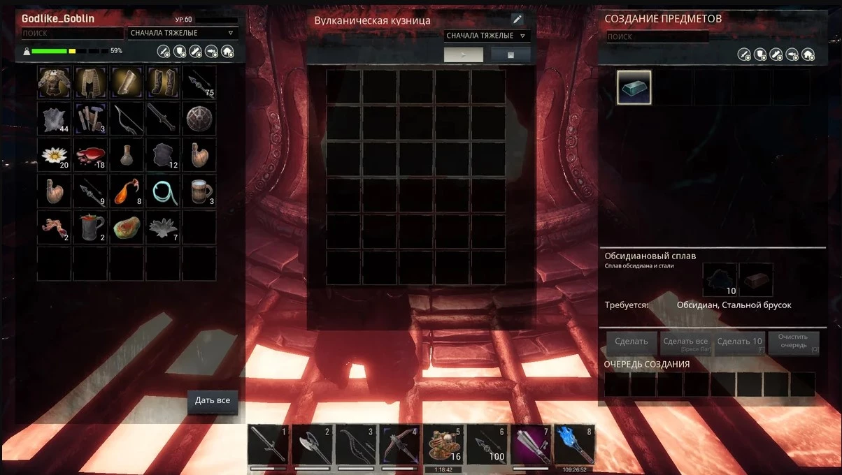Оружие из обсидиана, довольно сильное оружие, но далеко не самое эффективное в Землях Изгнанников. Даже среди образцов, которые можно крафтить самому. Сам Обсидиан легко добывается в вулканическом биоме. Но вот сделать с добытым ресурсом вы ничего не сможете, пока не пройдете данж Колодец Скелоса. Да и после этого, чтобы производить Обсидиановый сплав, из которого крафтится оружие, придется каждый раз возвращаться в Колодец. А это та еще морока, даже если знать безопасные пути в данж.