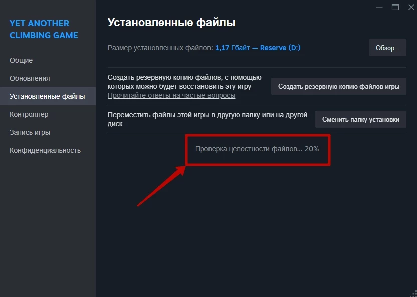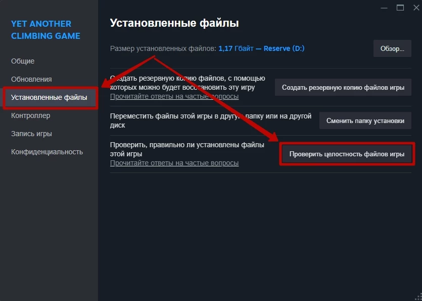 Перейдите в категорию «Установленные файлы» и нажмите «Проверить целостность файлов игры».