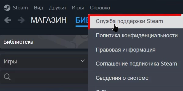 Откройте приложение Steam, нажмите на меню «Справка» и выберите «Служба поддержки Steam».