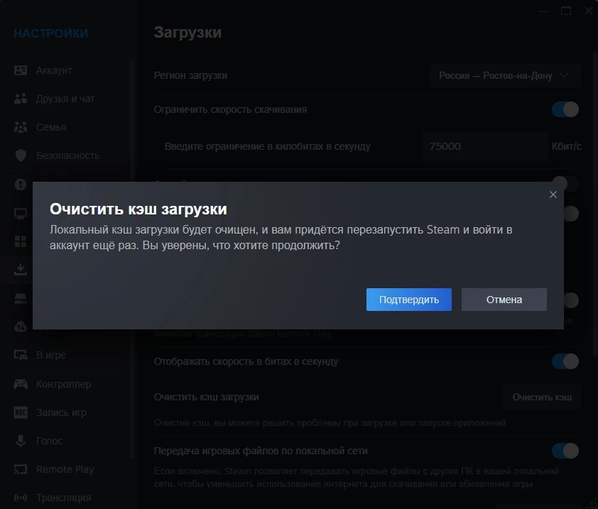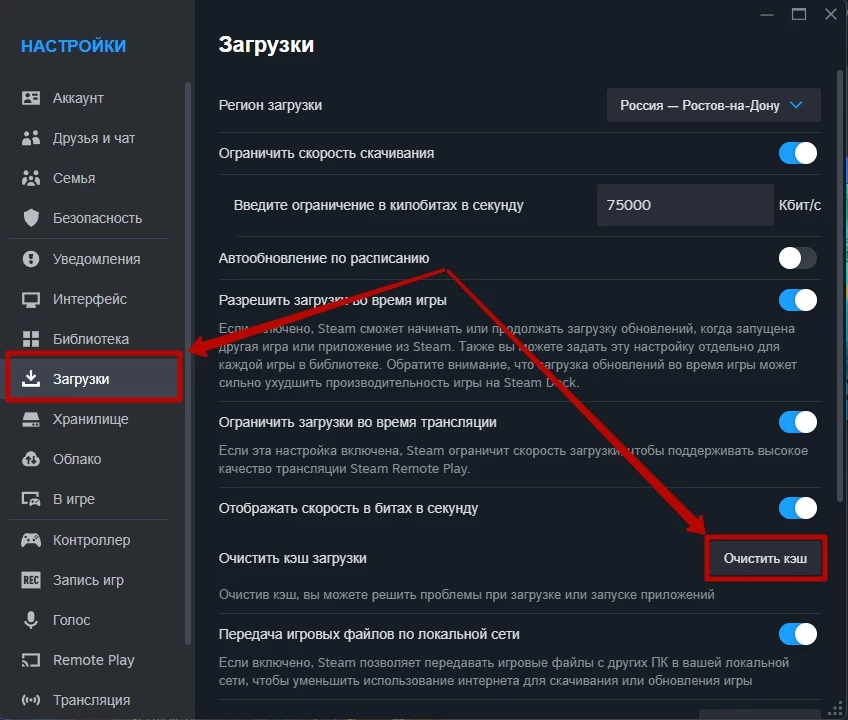 Для устранения проблемы откройте настройки Steam, перейдите в раздел «Загрузки» и нажмите кнопку «Очистить кэш».