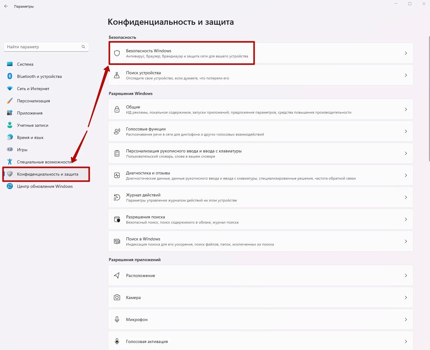 Откройте приложение настроек Windows, перейдите в раздел «Конфиденциальность и защита», выберите «Безопасность Windows».
