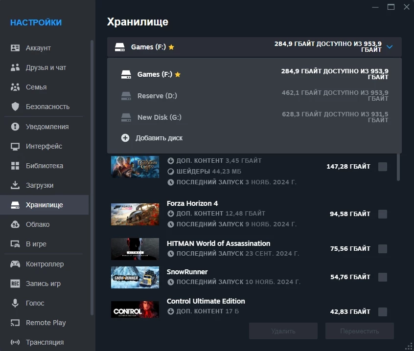 Откройте настройки Steam и перейдите в категорию «Хранилище». Просмотрите список локальных дисков для установки игр и выберите тот, на котором возникает ошибка записи при попытке установить или обновить игру.