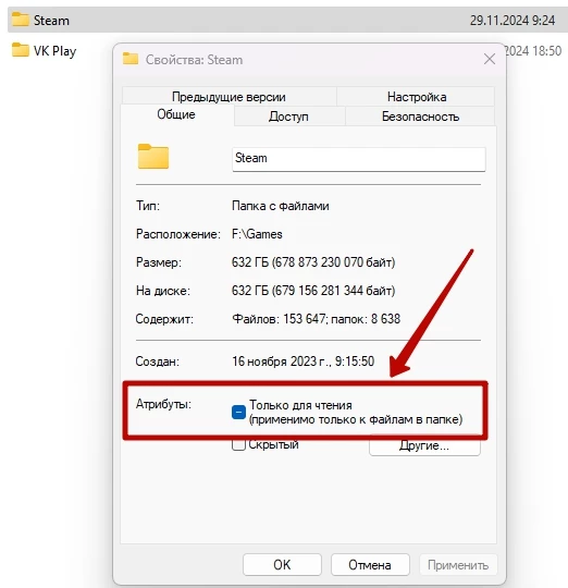 Обратите внимание: если вы устанавливаете игру на другой локальный диск, где расположен каталог Steam, убедитесь, что галочка «Только для чтения» снята именно в этом месте.