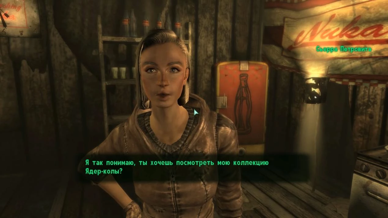 В беседе с девушкой он сможет принять повторяющийся квест на поиски особого напитка: необходимо собрать тридцать бутылок квантовой ядер-колы. За каждую из них полагается вознаграждение в сорок крышек, а при успешном выполнении задания Сьерра одарит его схемой ядерной гранаты и миссисипским пирогом (правда, ингредиенты придется принести с собой).