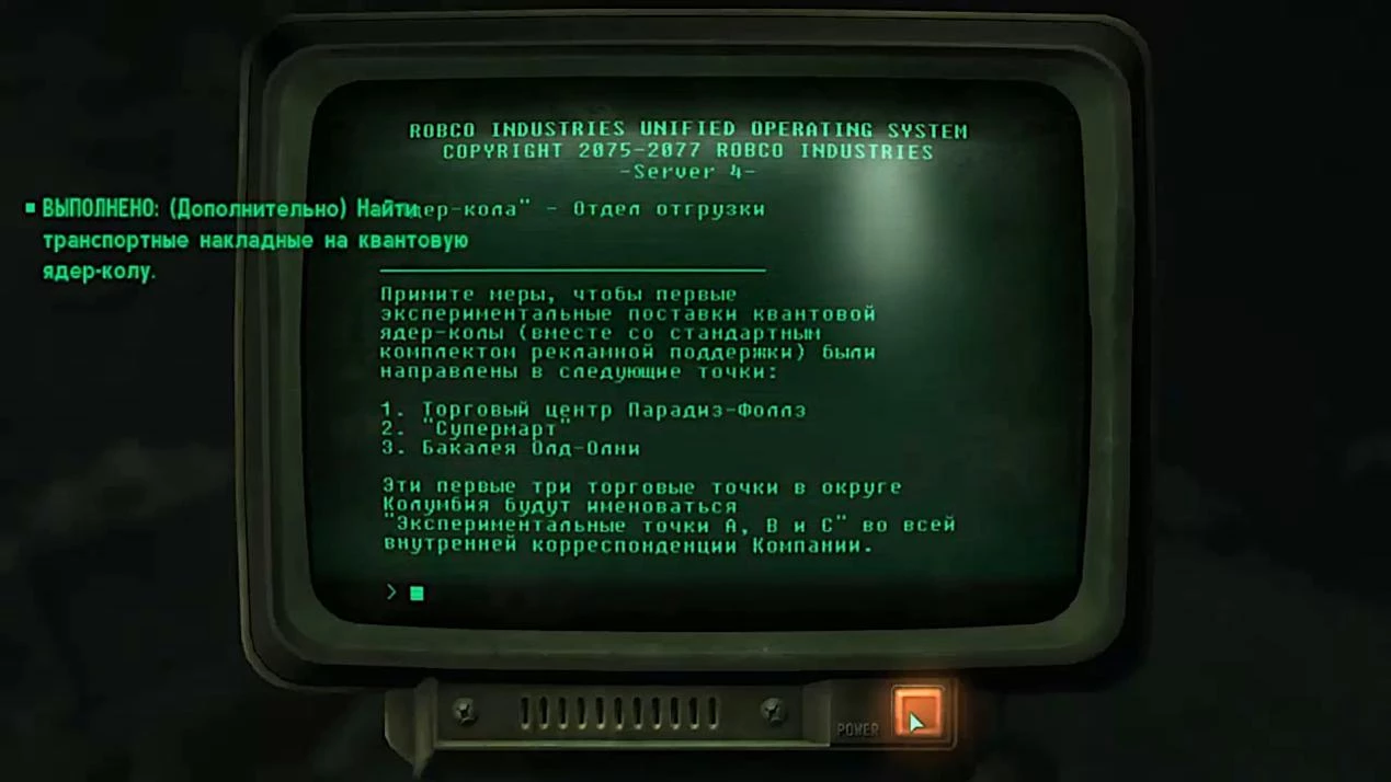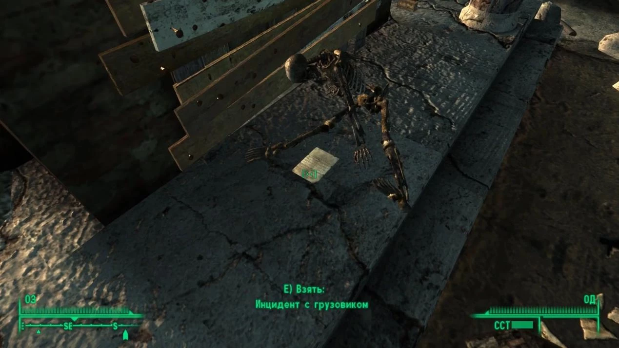 Что касается Олд-Олни, упоминаемого в докладах о поставках с завода, игрок вряд ли найдет там квантовую колу. Однако у входа в пожарную часть Путник наткнется на тело и таинственную записку, описывающую судьбу водителя, который вынужден был оставить свой транспорт и пешком добираться до городка, где и встретил свою гибель.