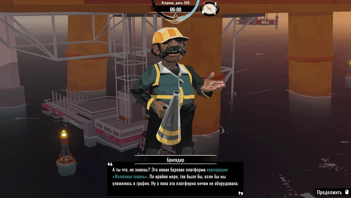Приблизившись к ней, пришвартуйтесь в местном порту и подойдите к грузовому лифту. Вас встретит рабочий в жёлтой униформе, который сообщит, что буровая установка принадлежит корпорации "Железная гавань".