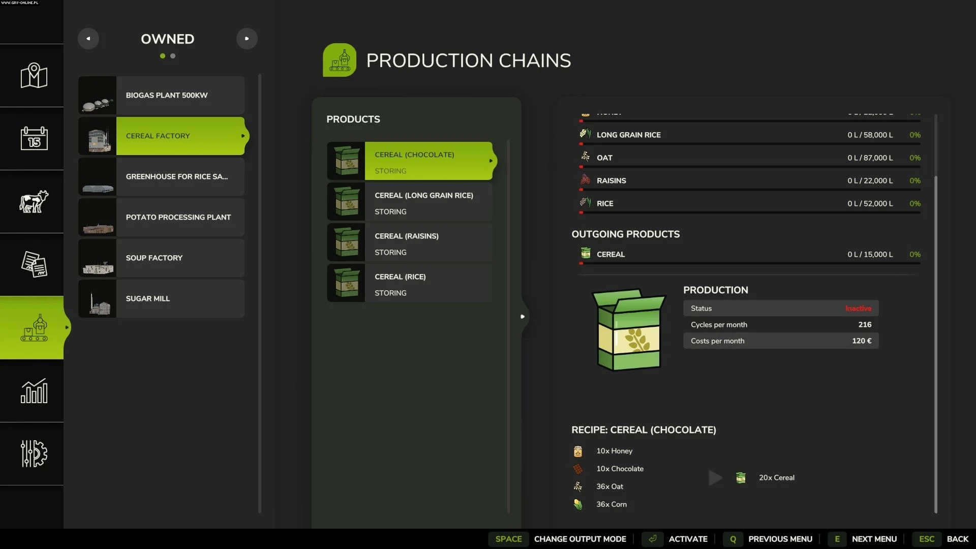 Кукурузу можно высаживать в апреле и мае, а убирать в октябре и ноябре. Лучшее время для ее продажи — январь, когда цена колеблется около 1500 евро за тонну. Если у вас имеется доступ к меду, овсу и шоколаду или изюму, вы сможете перерабатывать кукурузу в сухие завтраки на фабрике, где стоимость продажи может составлять приблизительно 12 000 евро за тонну. Кукурузу также можно применять для кормления свиней.